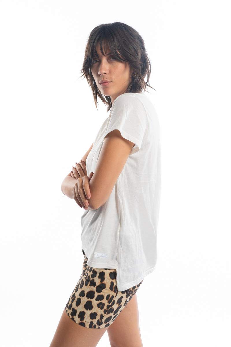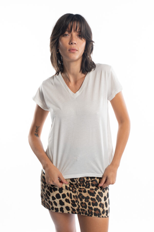 Remera básica escote en V, confeccionada en 100% algodón peruano pima color cruda, una tela natural caracterizada por ser muy suave y cómoda.