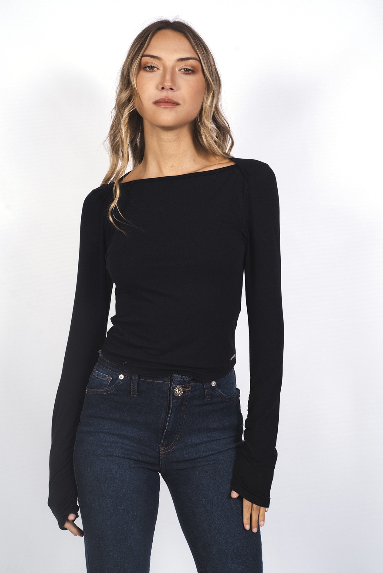 Remera manga larga cuello bote, confeccionada en microfibra elastizada.