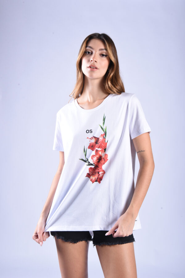 Diseño de estampado vertical de flores rojas vibrantes que recorre la parte frontal, añadiendo un toque fresco y moderno.