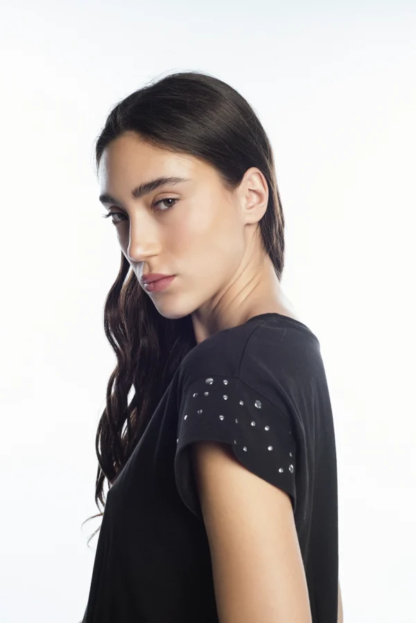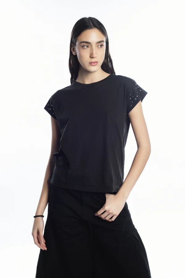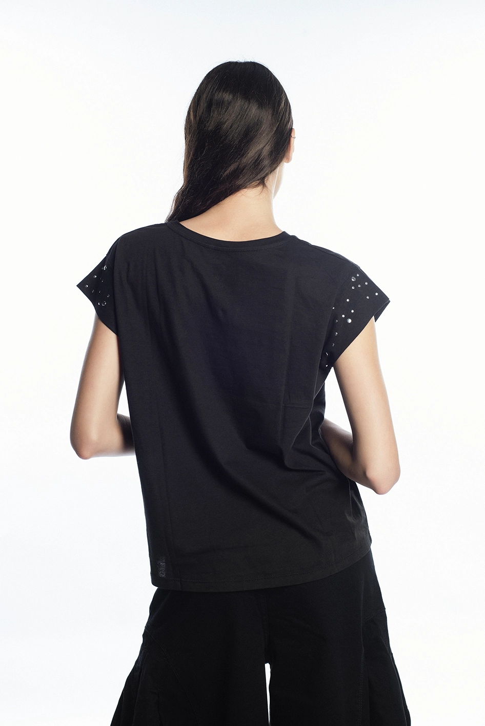 Diseñada para un fit holgado y cómodo. Presenta mangas cortas tipo japonesas con dobladillo fijo y apliques de tachas que aportan un detalle distintivo y sofisticado.