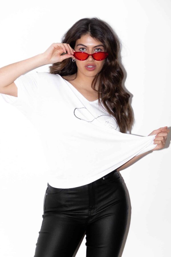 Remera escote en v y manga corta, confeccionada en crepe con viscosa y lycra.