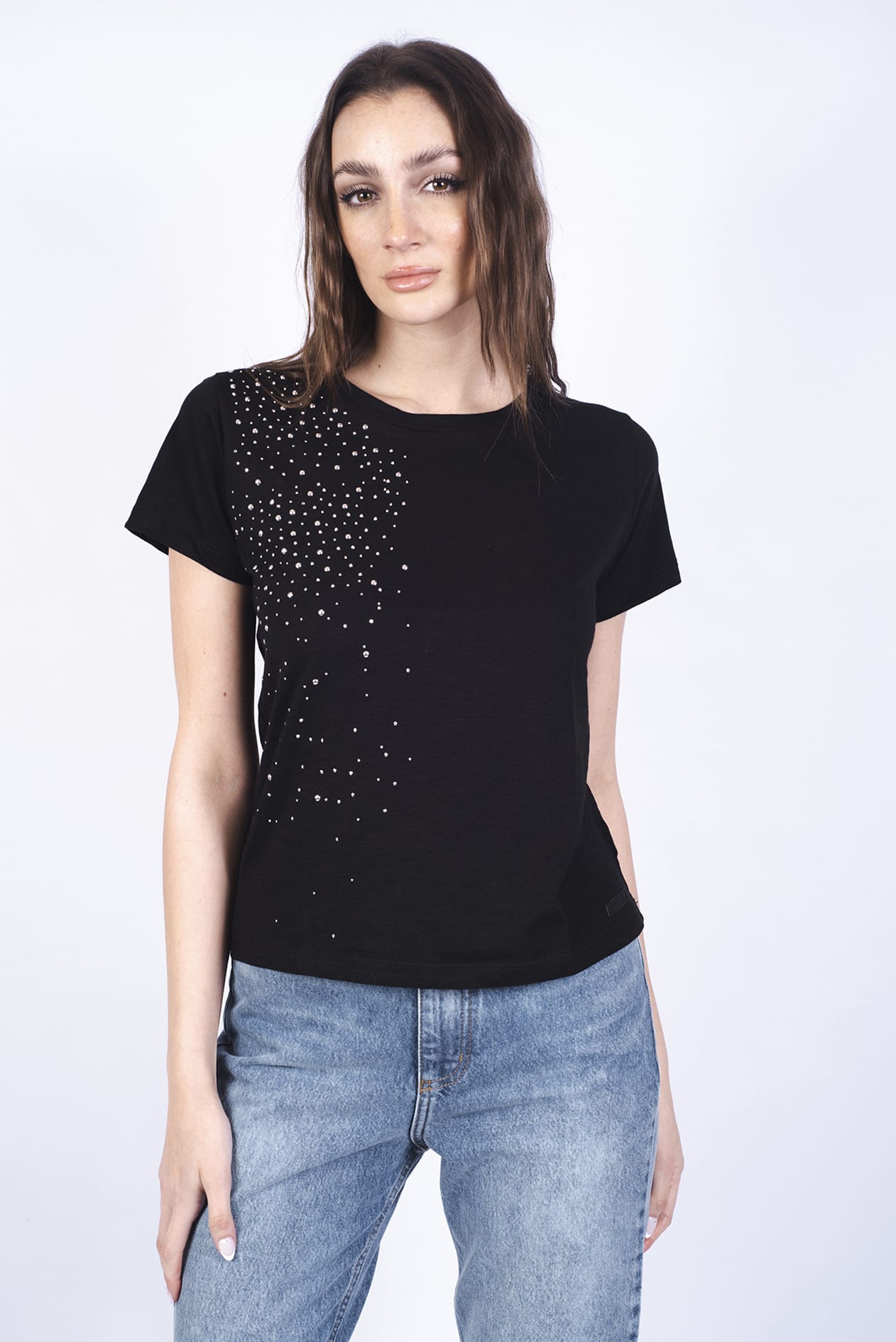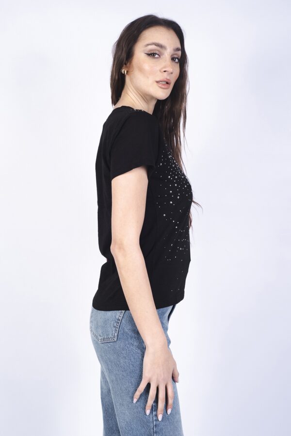 Detalle de transfer de tachas color plata en el frente.