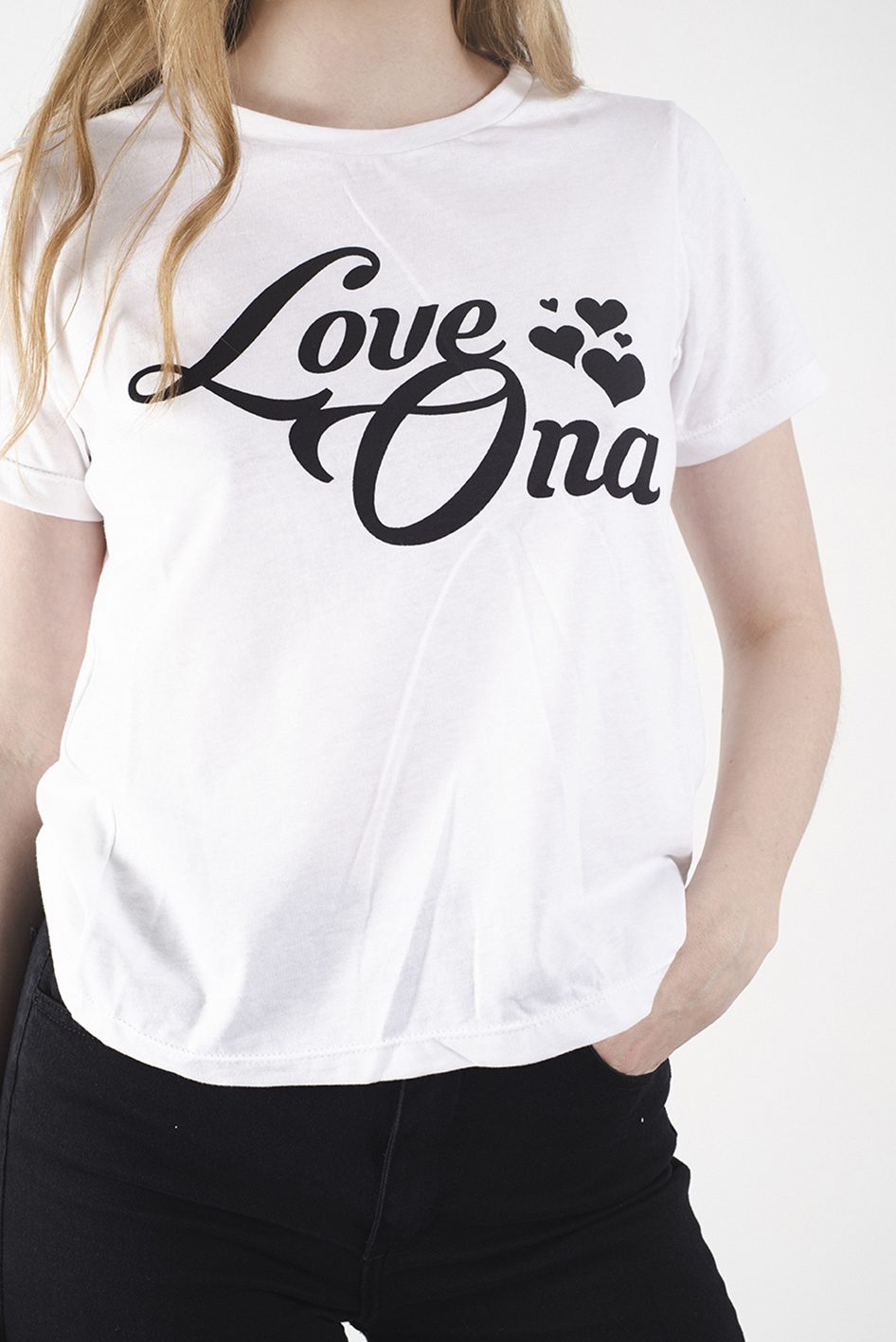 Estampa a contratono centralizada en el frente con leyenda “love ona”