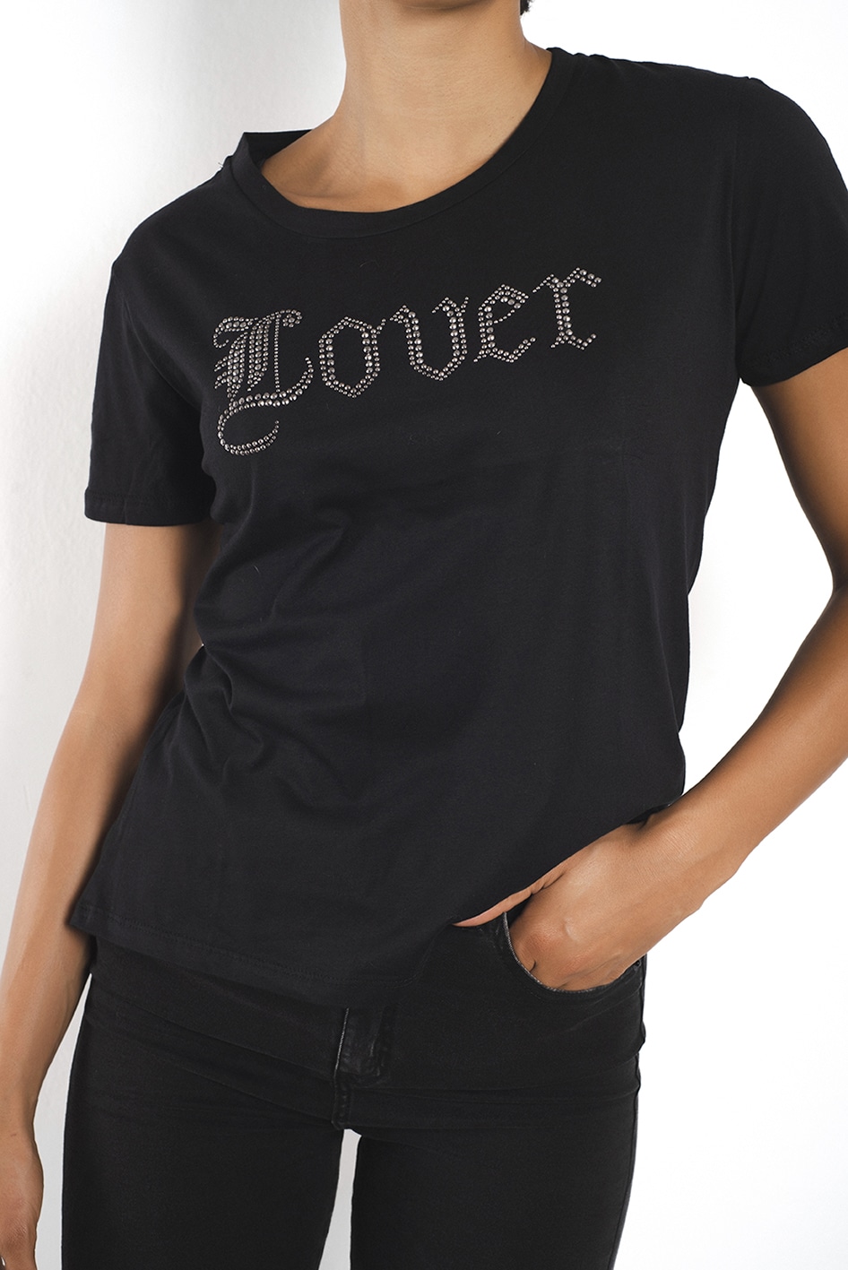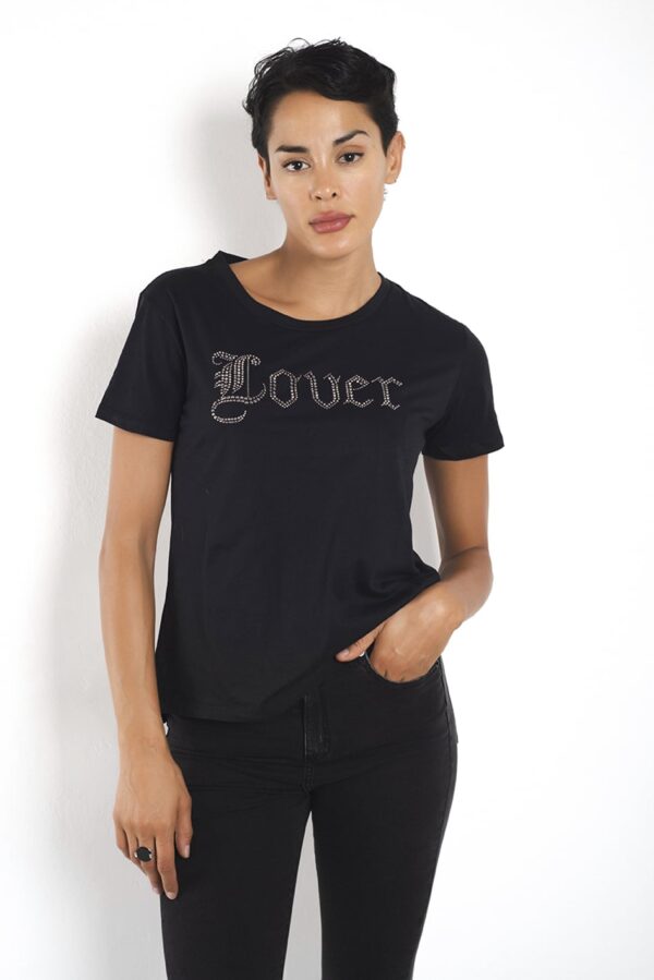 Larga por arriba de la cadera, de calce clásico con diseño de transfer de strass centralizada en el frente
