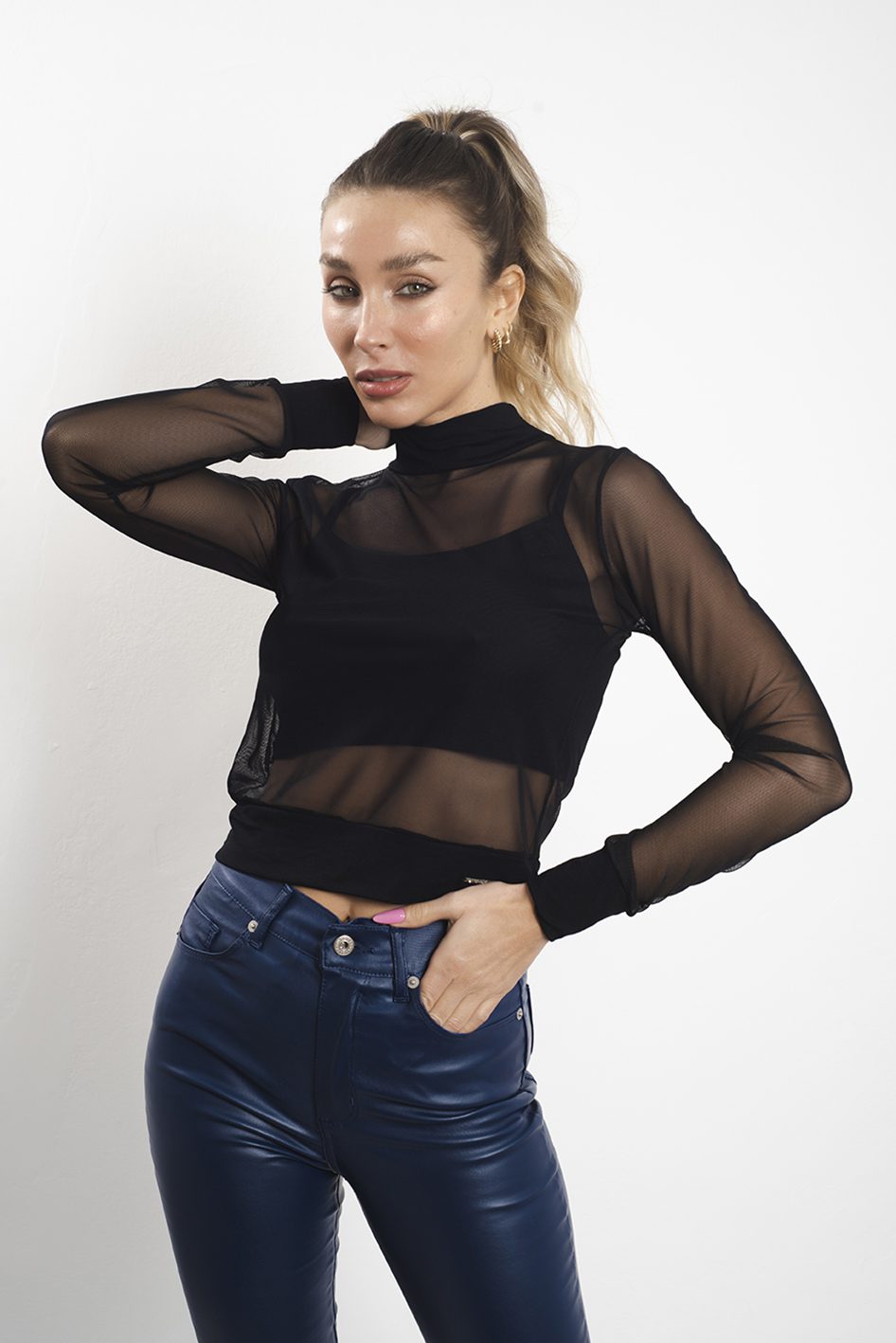 Polera cuello alto y manga larga, confeccionada en microtul con lycra color negra.