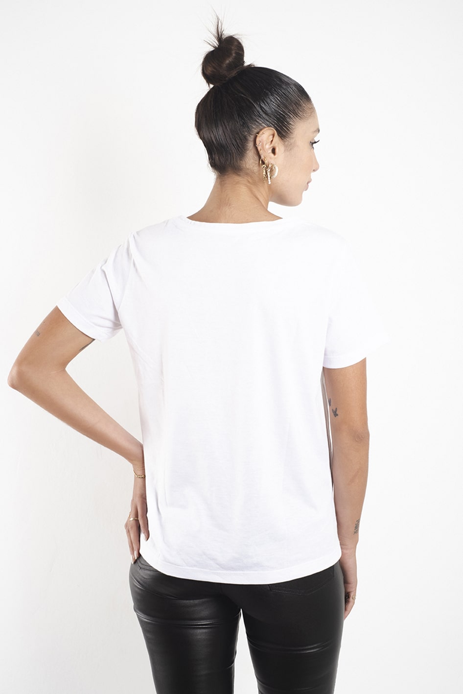 De calce clásico con estampa centralizada en el frente y detalles de transfer de strass negros en forma de estrellas.