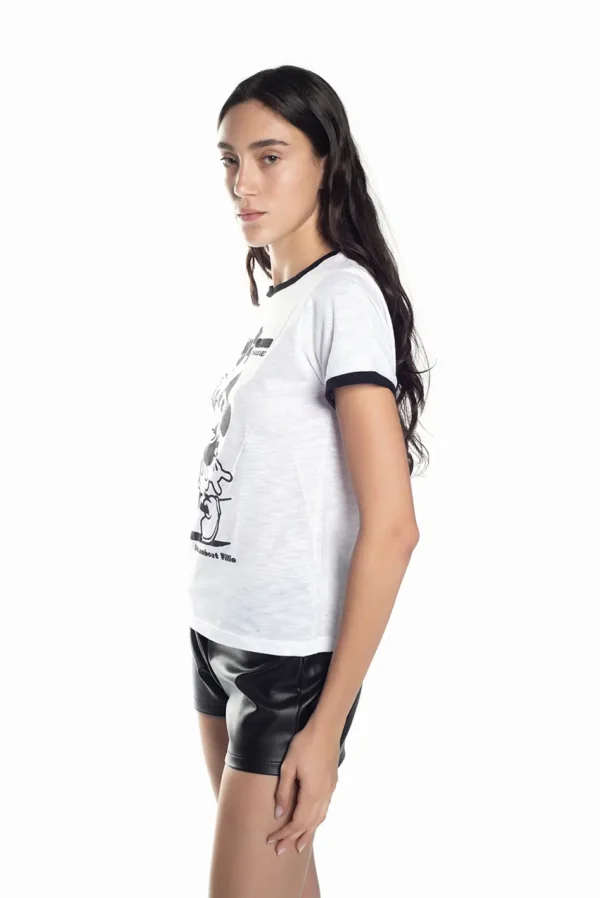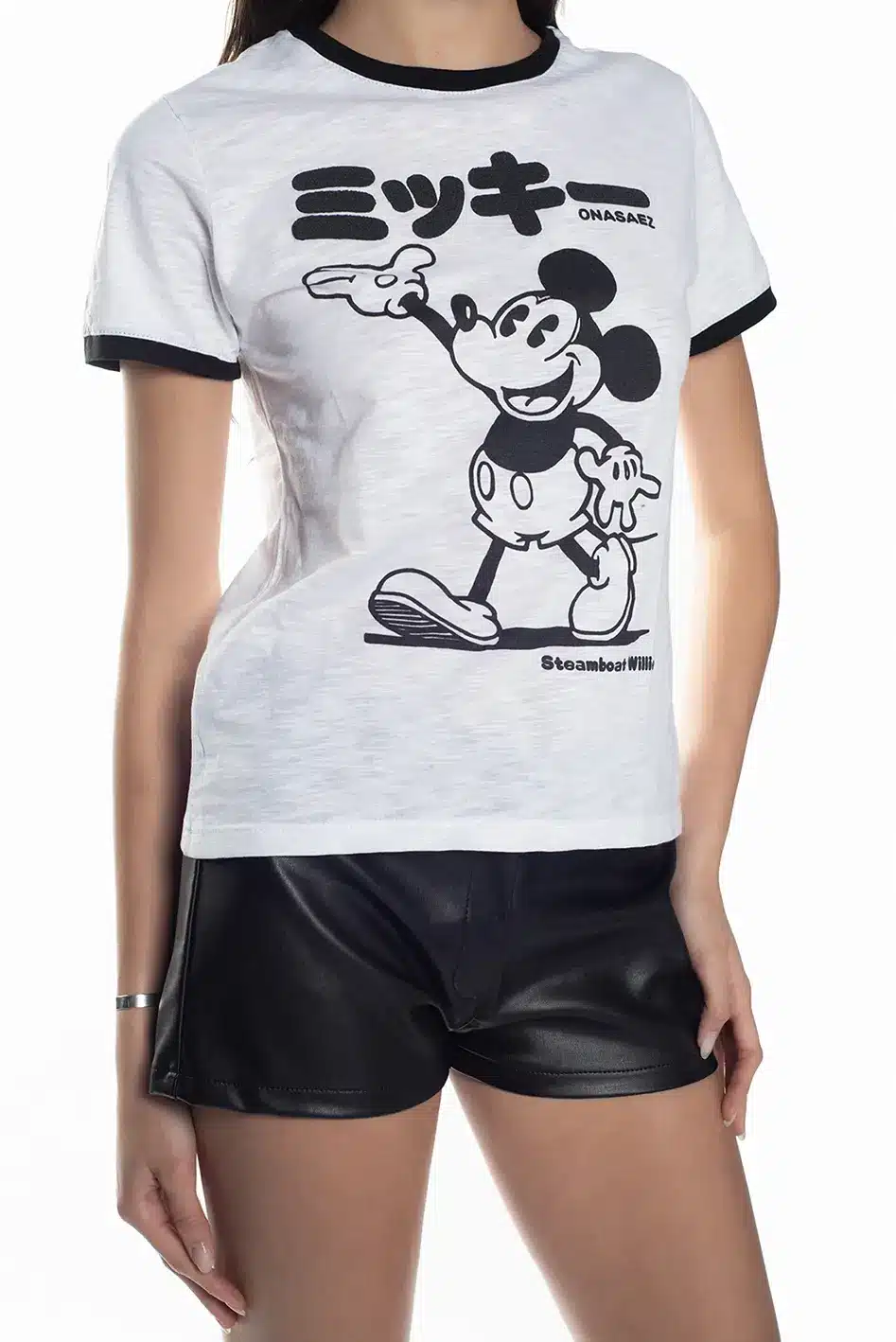 Estampa con efecto 3d del diseño de steamboat willie (1928), la primera representación del ratón más famoso del mundo, en líneas monocromáticas que evocan la estética retro. ideal para un look relajado, esta prenda captura la esencia de la moda urbana con un guiño nostálgico, perfecta para quienes buscan destacar con piezas originales y versátiles