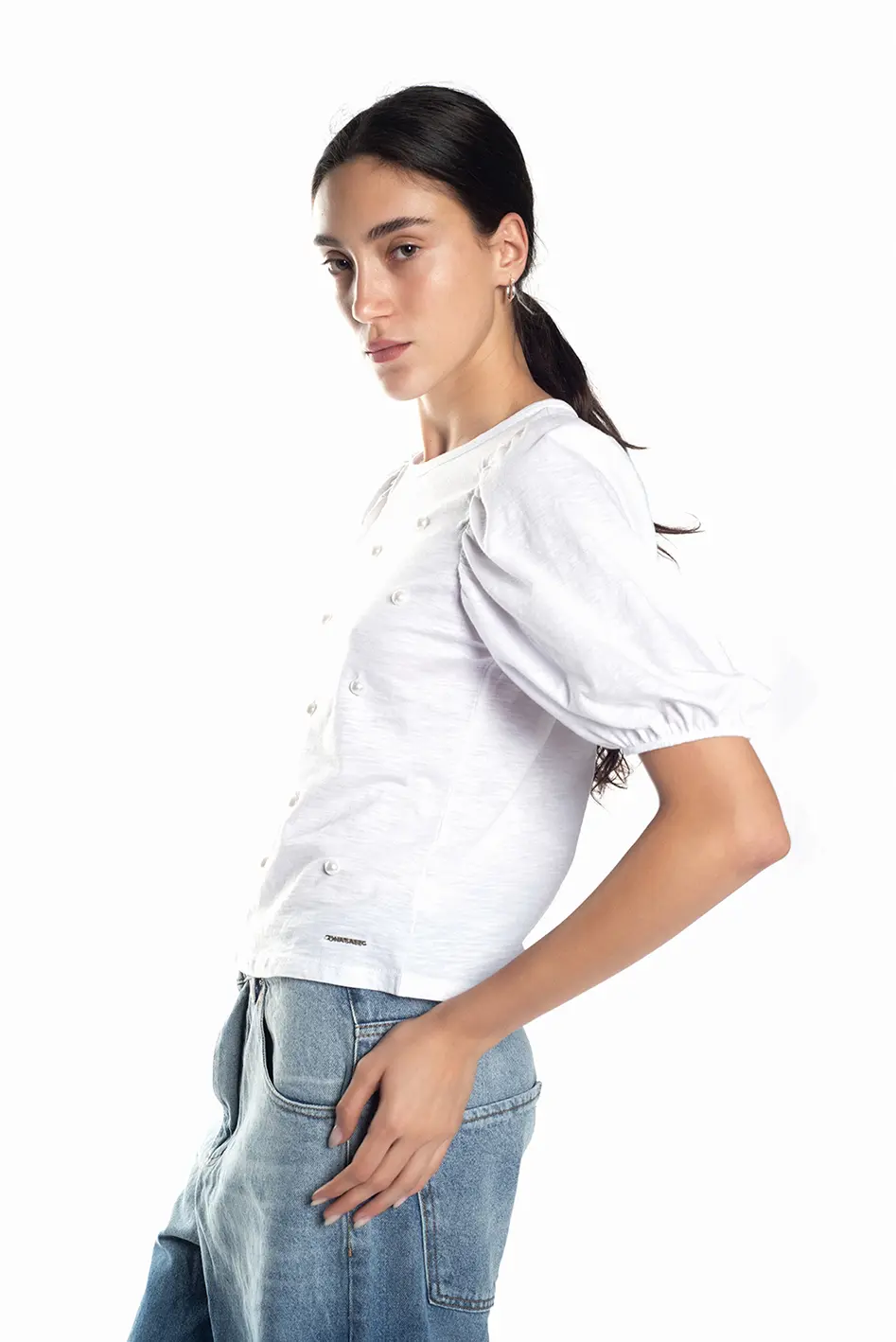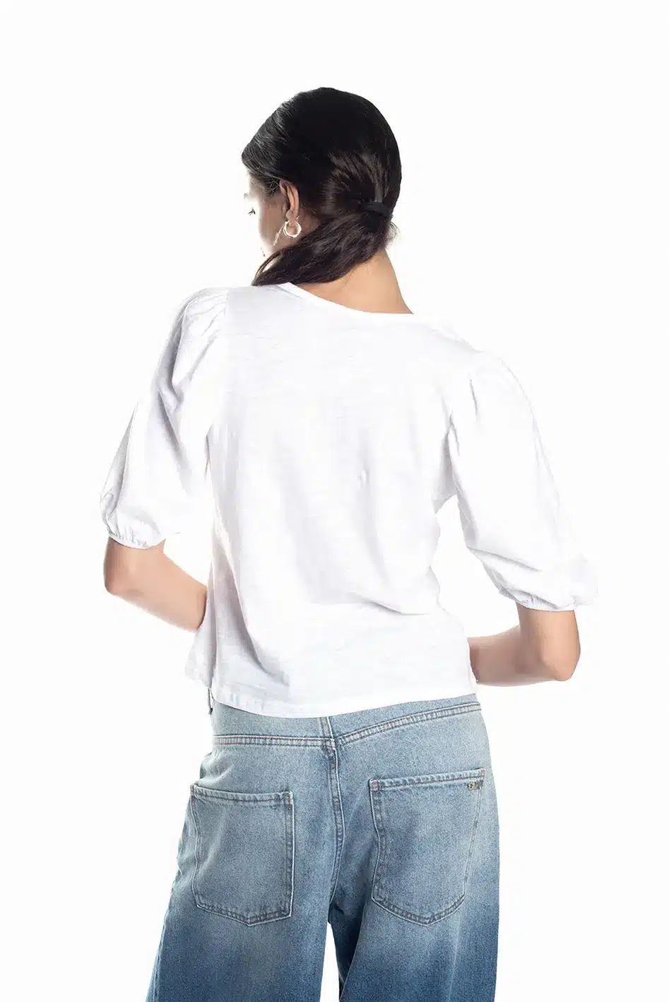 Manga largo 3/4 con volumen tipo balloon y detalle de aplique de piedras de acrílico a tono, distribuidas en la parte frontal que aportan un toque sofisticado.
