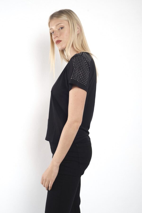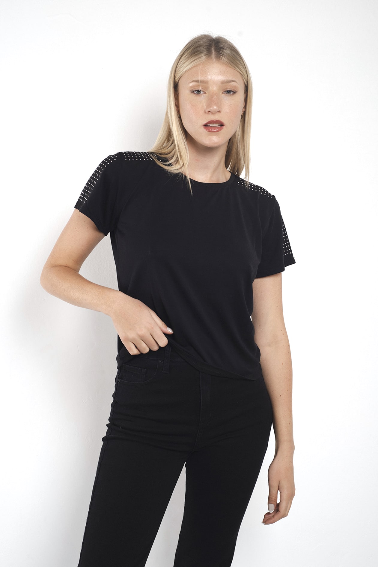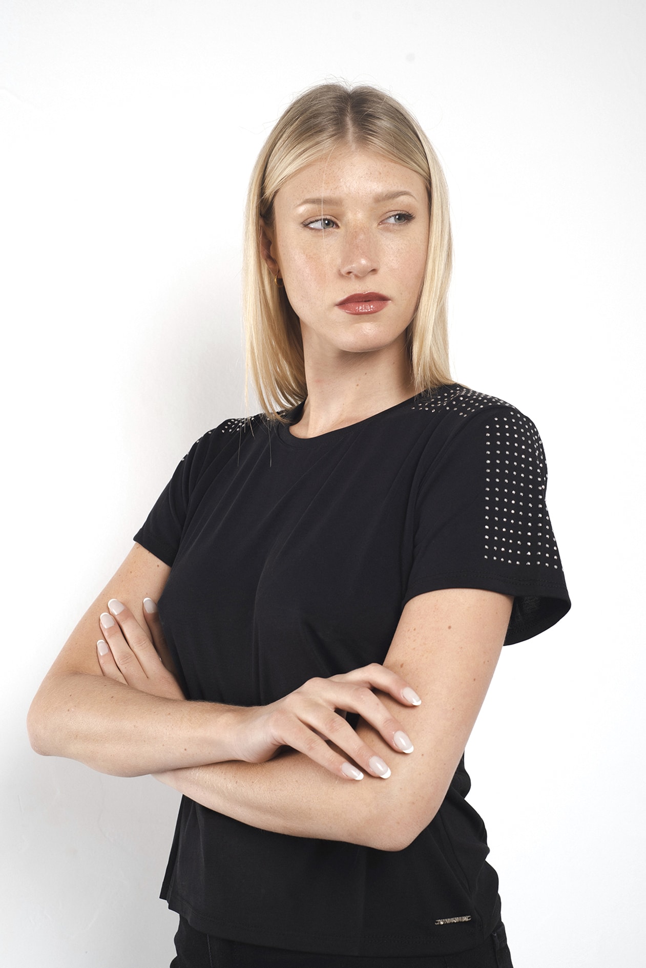 Remera cuello redondo y manga corta, confeccionada en viscosa gamuzada color negra.