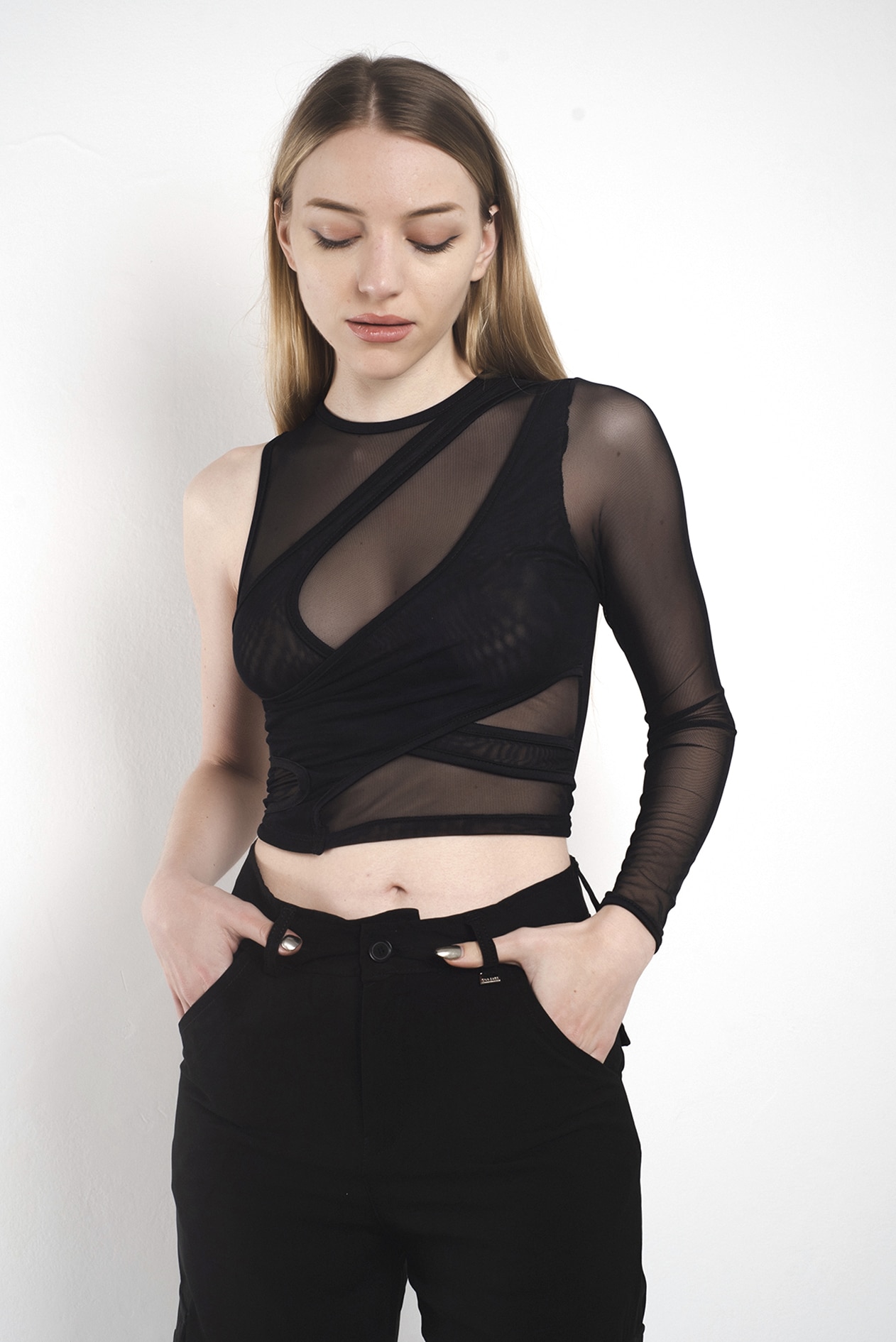 Top superpuesto manga larga de lado derecho, confeccionado en tull con lycra color negro.