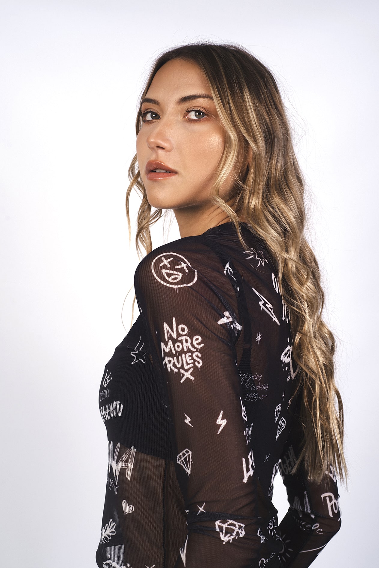 Remera manga larga y cuello redondo, confeccionada en tull con lycra, estampado a contratono con un diseño exclusivo para ona saez.