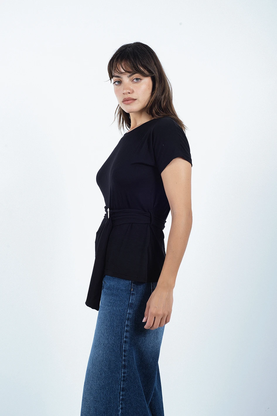 El detalle distintivo está en la cintura: un lazo del mismo tejido con hebilla metálica en forma de aro, que permite ajustar y definir la silueta, sumando un toque moderno y sofisticado.