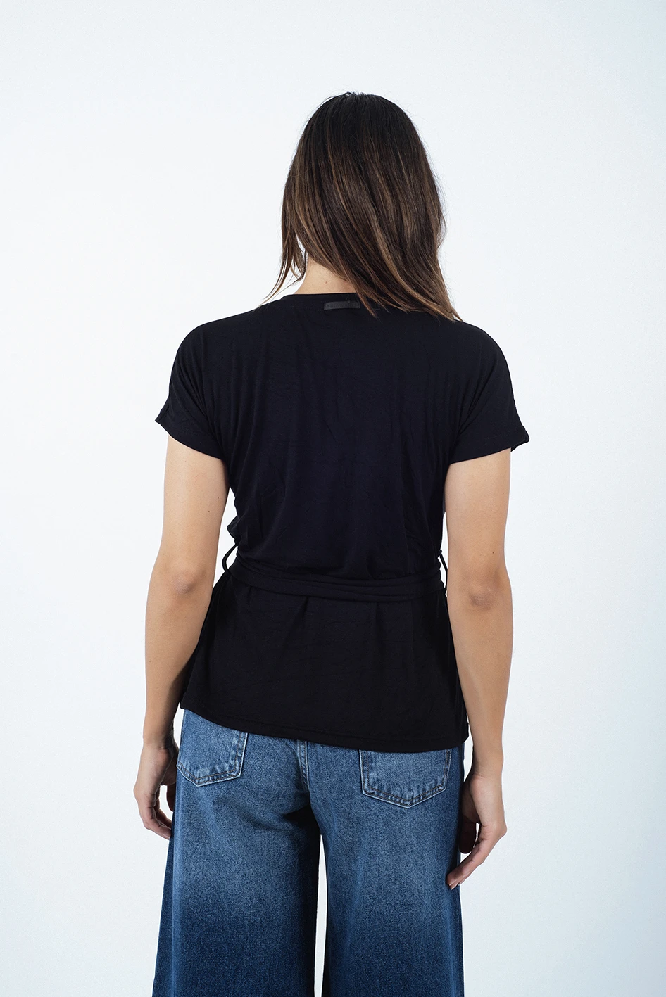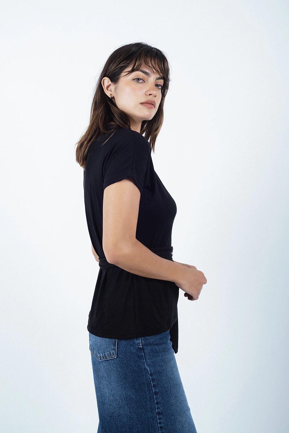 Presenta cuello redondo y mangas cortas con dobladillo, aportando un estilo clásico y versátil.