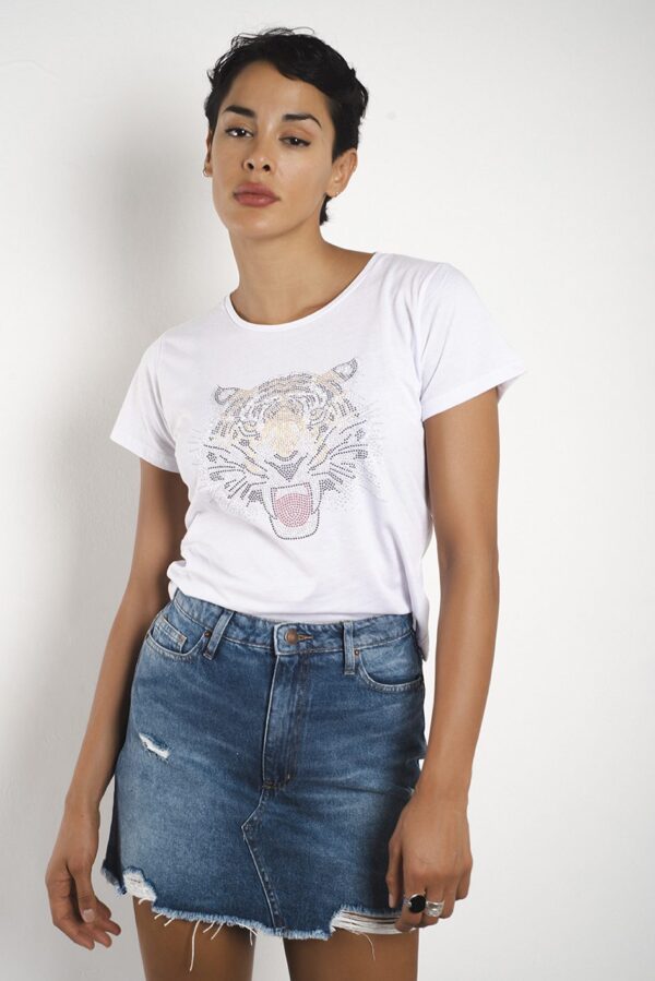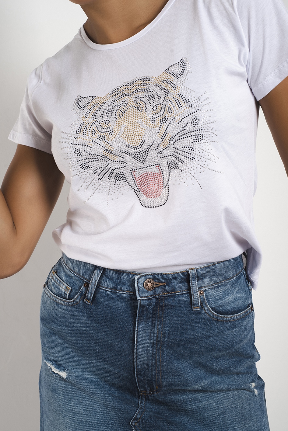 Larga por encima de la cadera, de calce clásico con diseño de transfer de strass centralizado en el frente