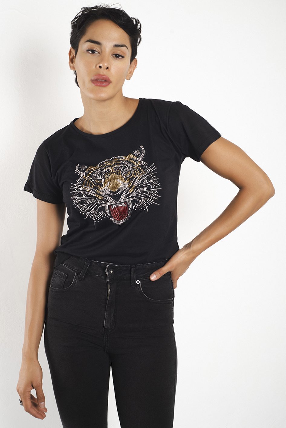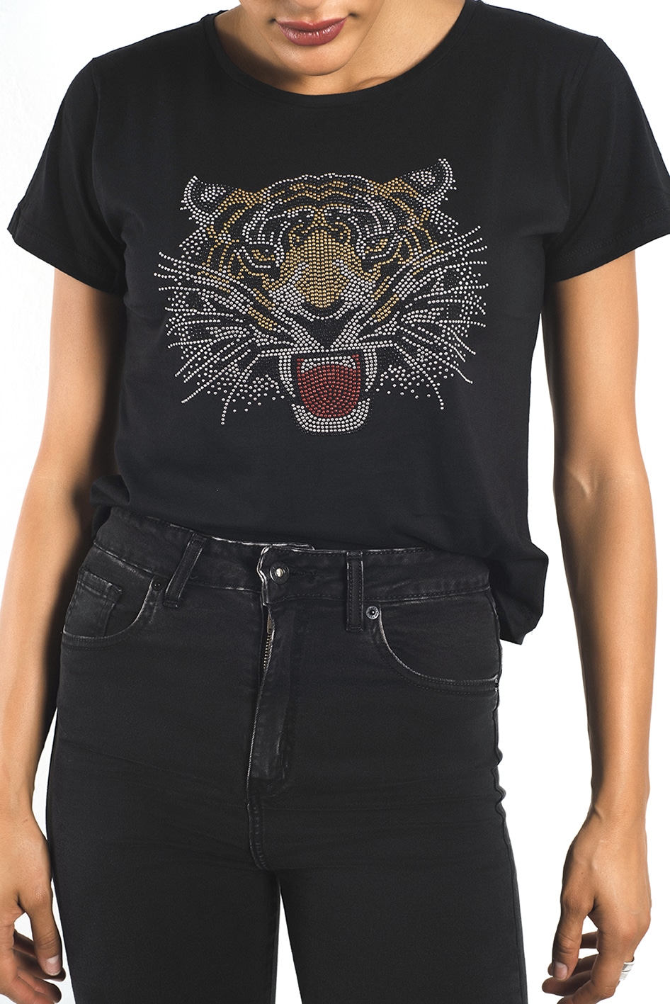 Larga por encima de la cadera, de calce clásico con diseño de transfer de strass centralizado en el frente