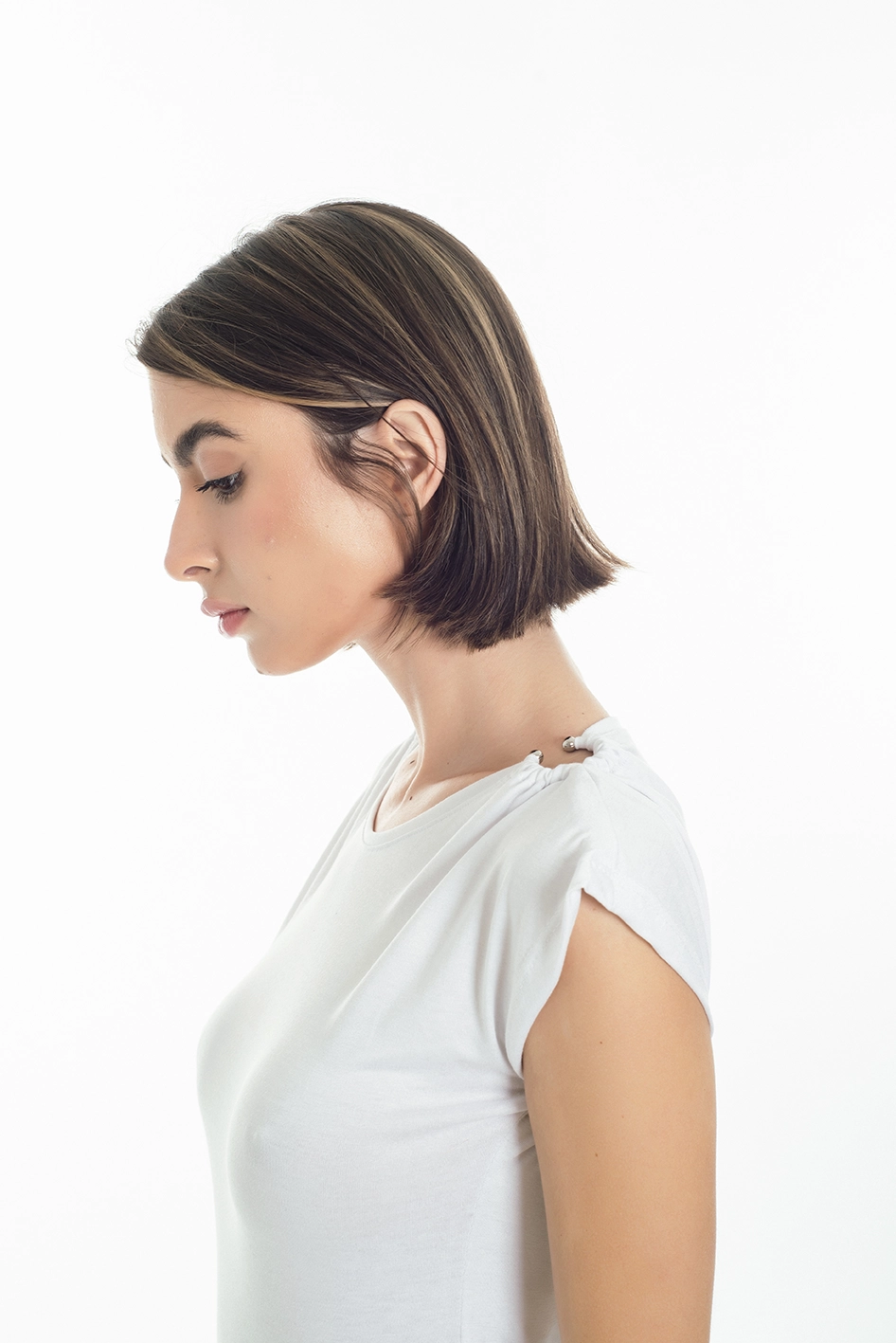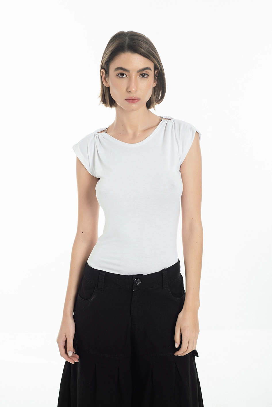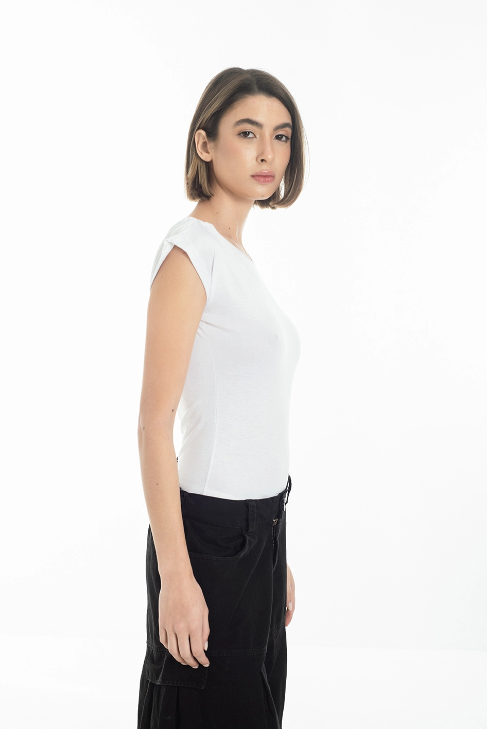 Remera de algodón con lycra color blanca, de calce al cuerpo y mangas cortas estilo cap.