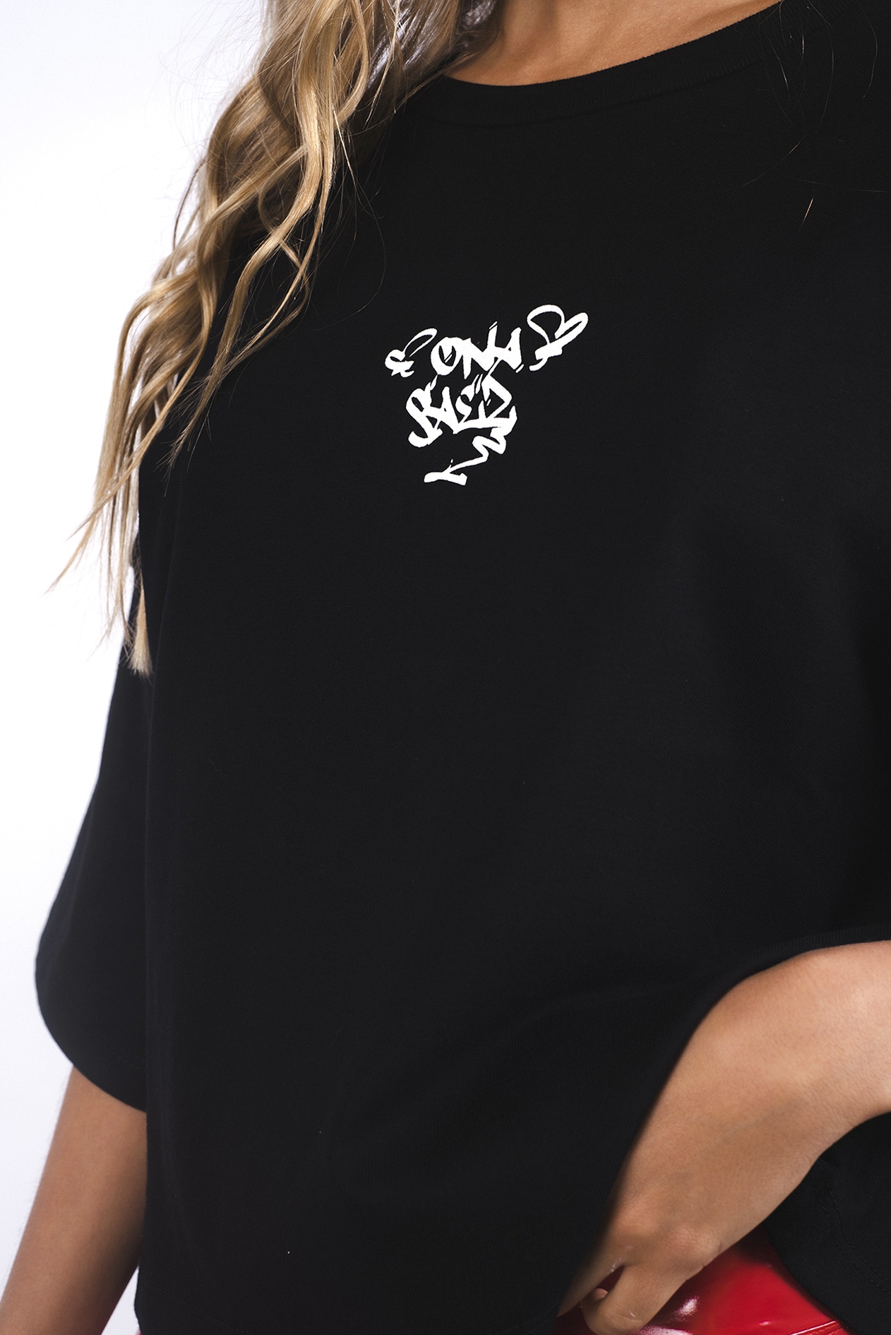 Silueta amplia, larga por debajo de la cintura con estampa a contra tono centralizada en el frente