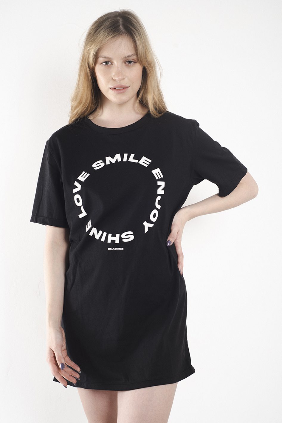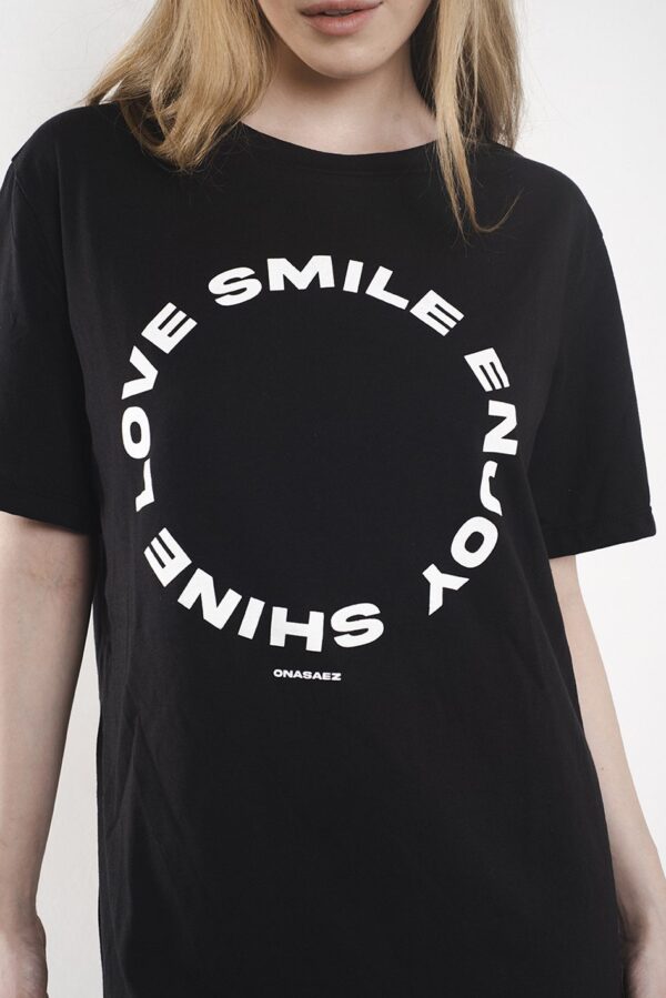 Estampa a contratono centralizada en el frente, con leyenda “shine love smile enjoy”