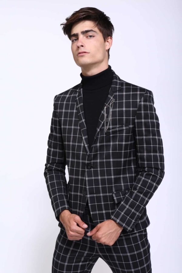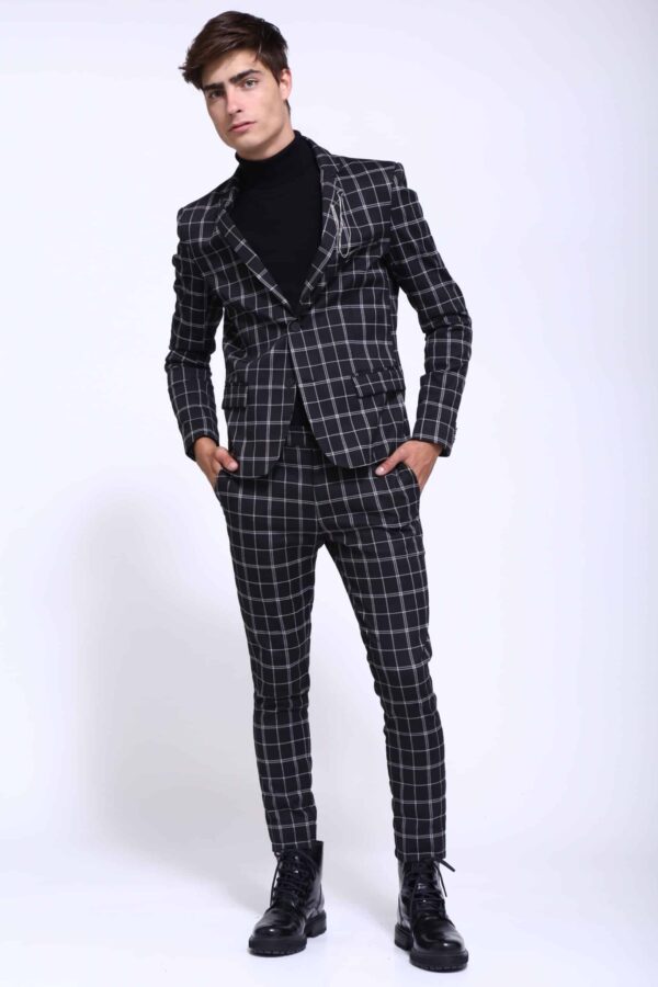 Solapas clásicas, cierre de dos botones con logo de marca y bolsillos delanteros con solapa.