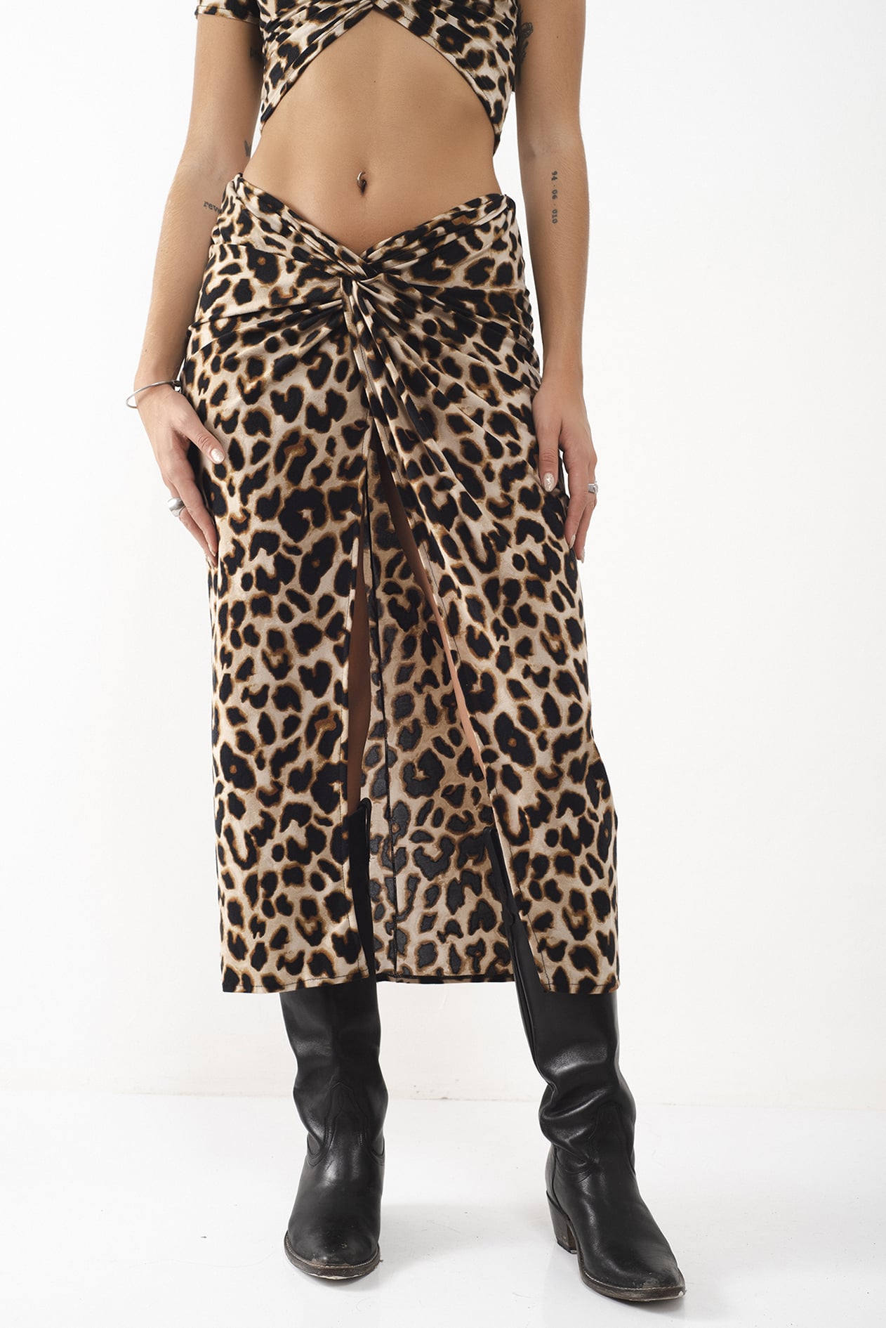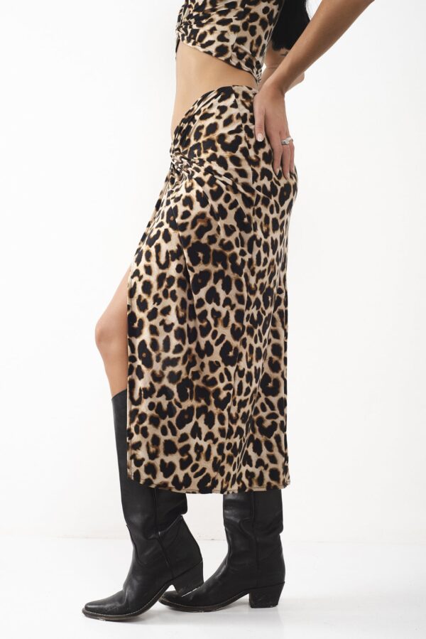 Cintura elástica, detalle de torzada en ambas prendas y tajo delantero en la falda