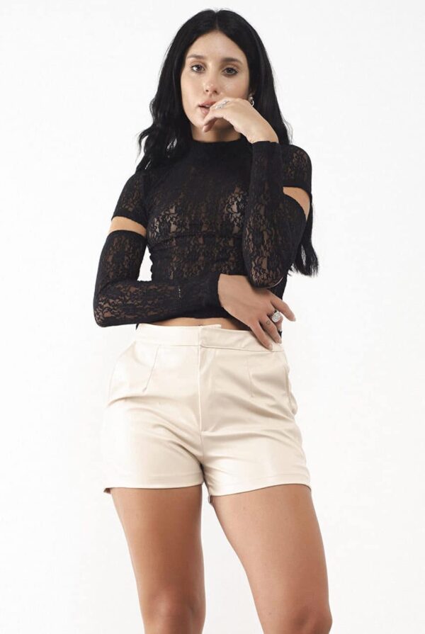 Short tiro medio tipo sastrero, confeccionado en simil cuero color crudo