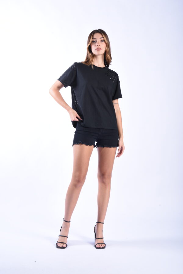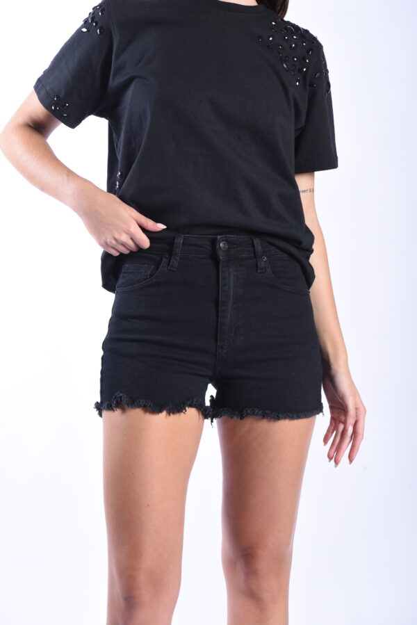 Short tiro alto confeccionado en tejido elastizado 98% algodón, 2% elastano con lavado stone wash.