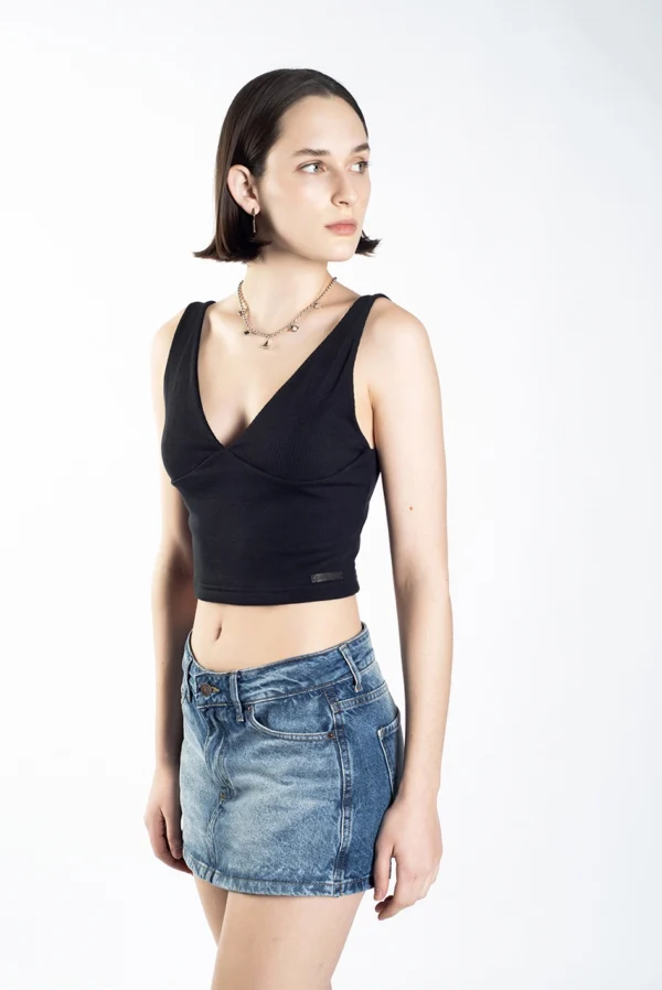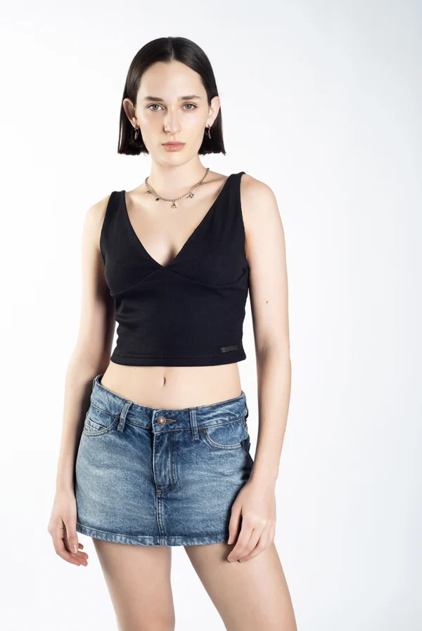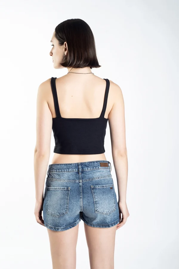Short pollera tiro medio, confeccionado en Denim rigido 100% algodón, lavado azul medio con bigotes laser y localizado.
