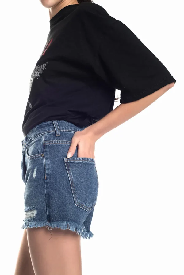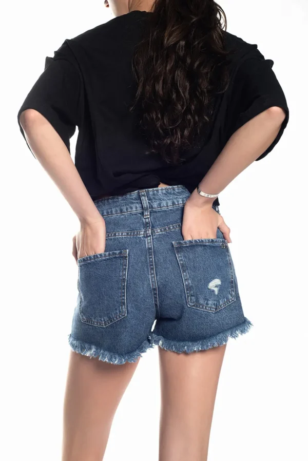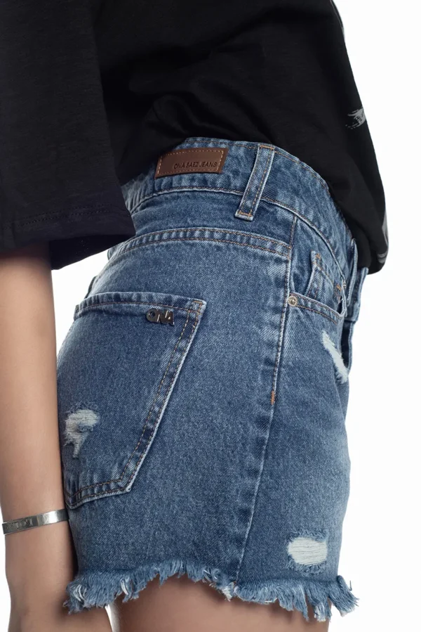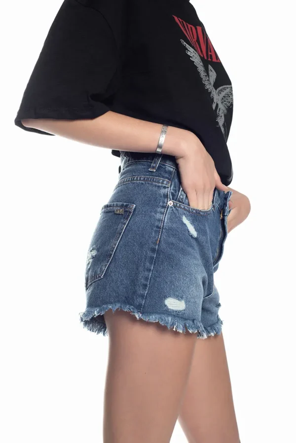 Short Mom tiro alto, confeccionado en Denim rigido 100% algodón, lavado azul oscuro con bigotes laser, localizado y roturas.