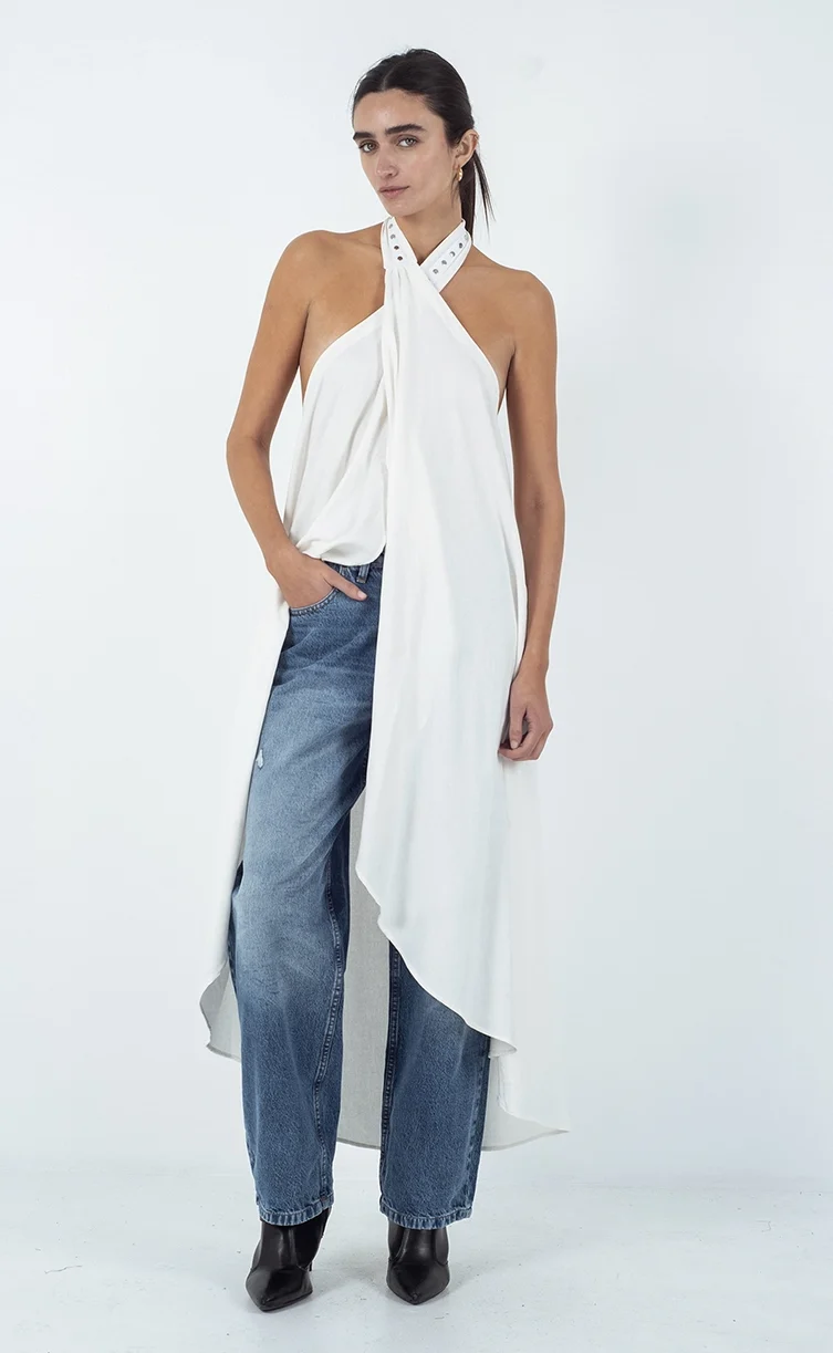 Las tiras cuentan con apliques metálicos que suman un detalle moderno y distintivo. Su largo irregular y caída liviana aportan movimiento y un aire sofisticado.