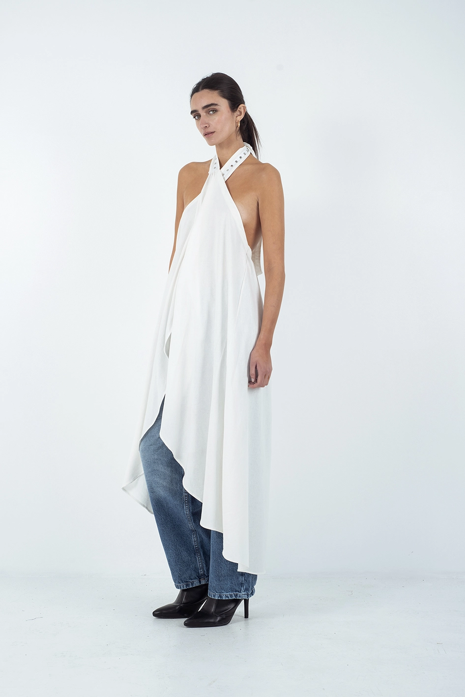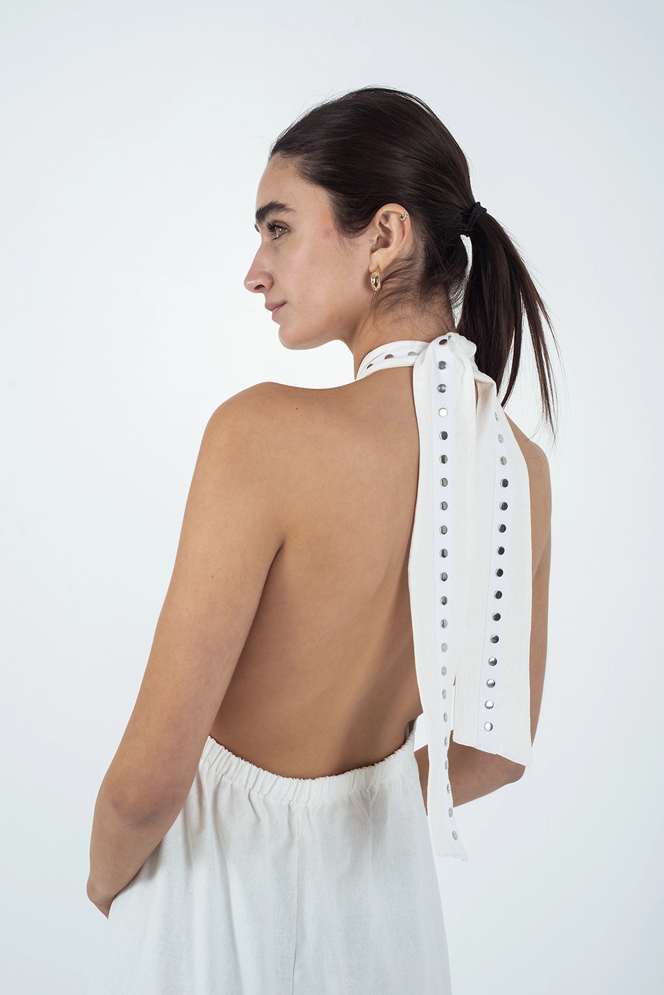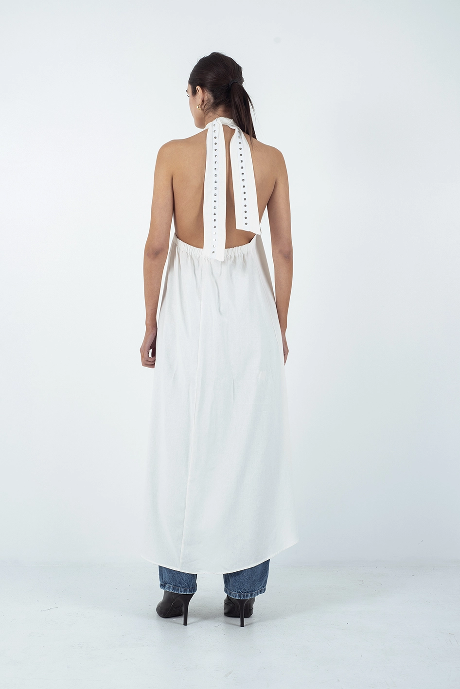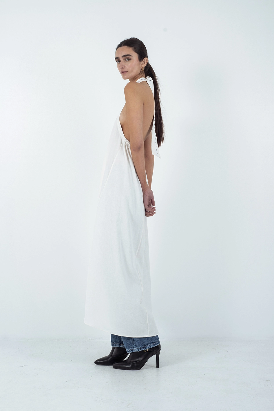 Solero largo confeccionado en lino con spandex, de silueta amplia y fluida. Presenta un diseño halter con escote cruzado en el delantero y espalda descubierta, con tiras anchas que se atan en la nuca.