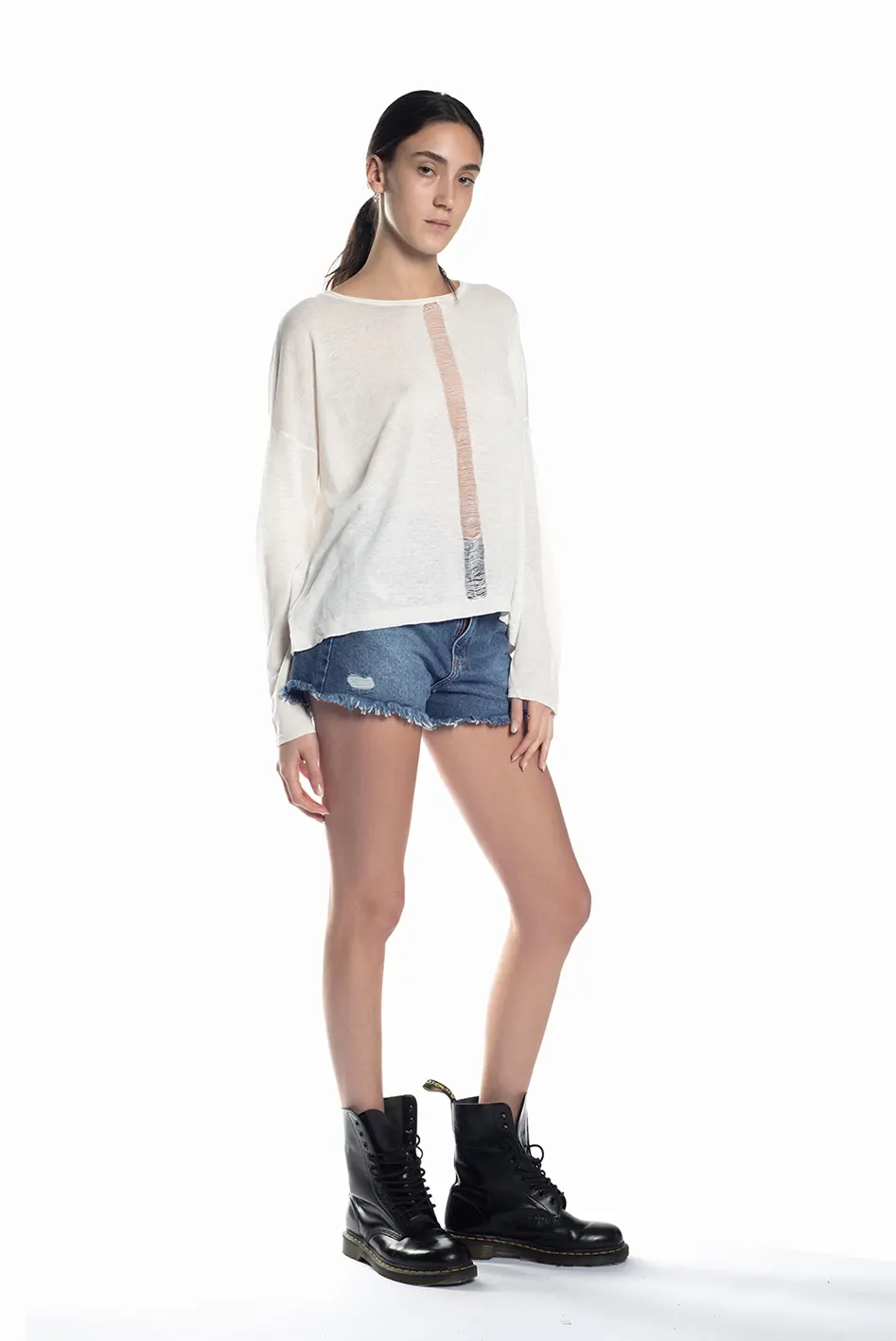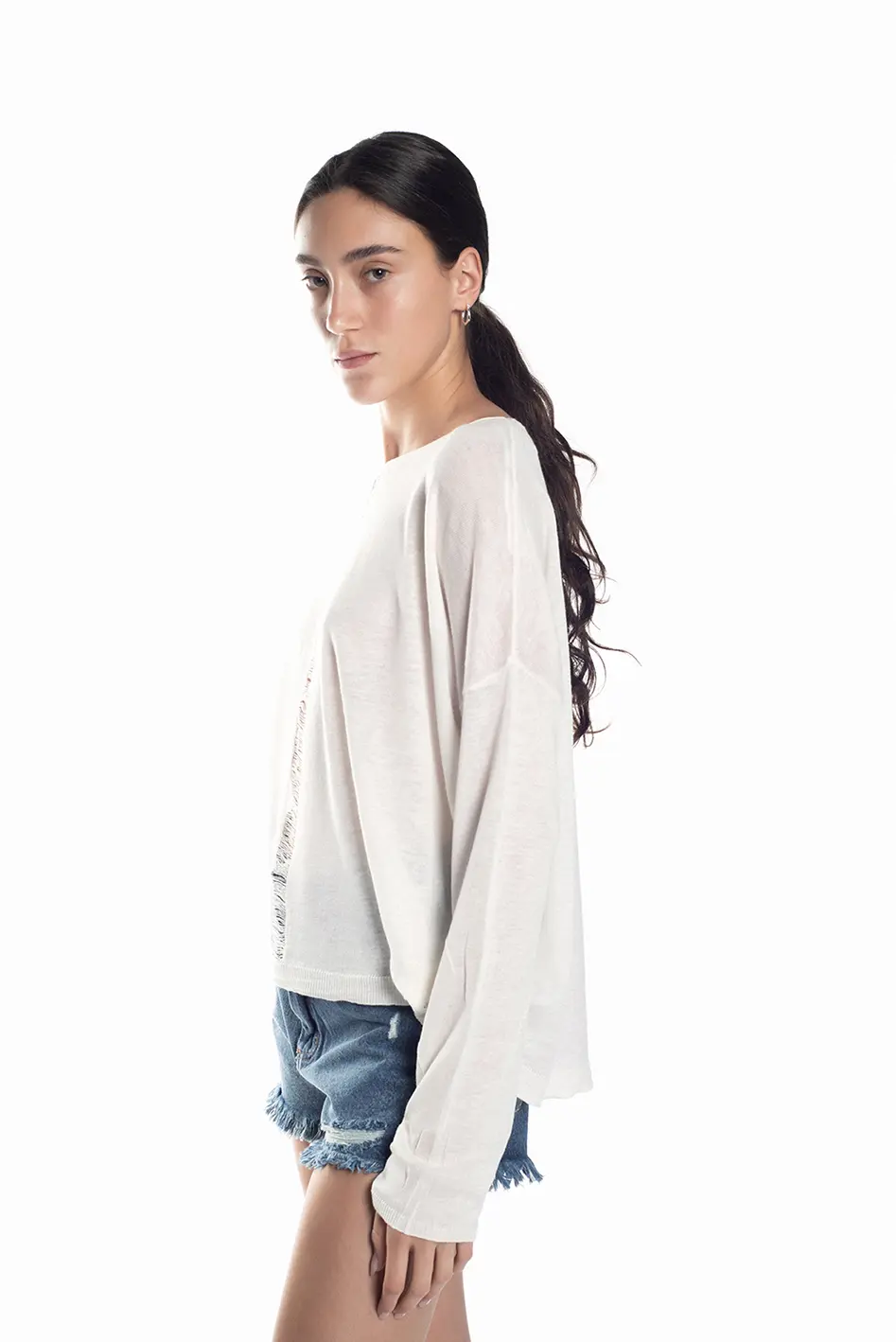 Diseño relajado con detalle central de tejido deshilachado en la parte frontal, que añade un toque moderno y desenfadado. su corte holgado aporta comodidad y versatilidad, perfecto para combinar con shorts Denim o pantalones ajustados para un look casual y actual.