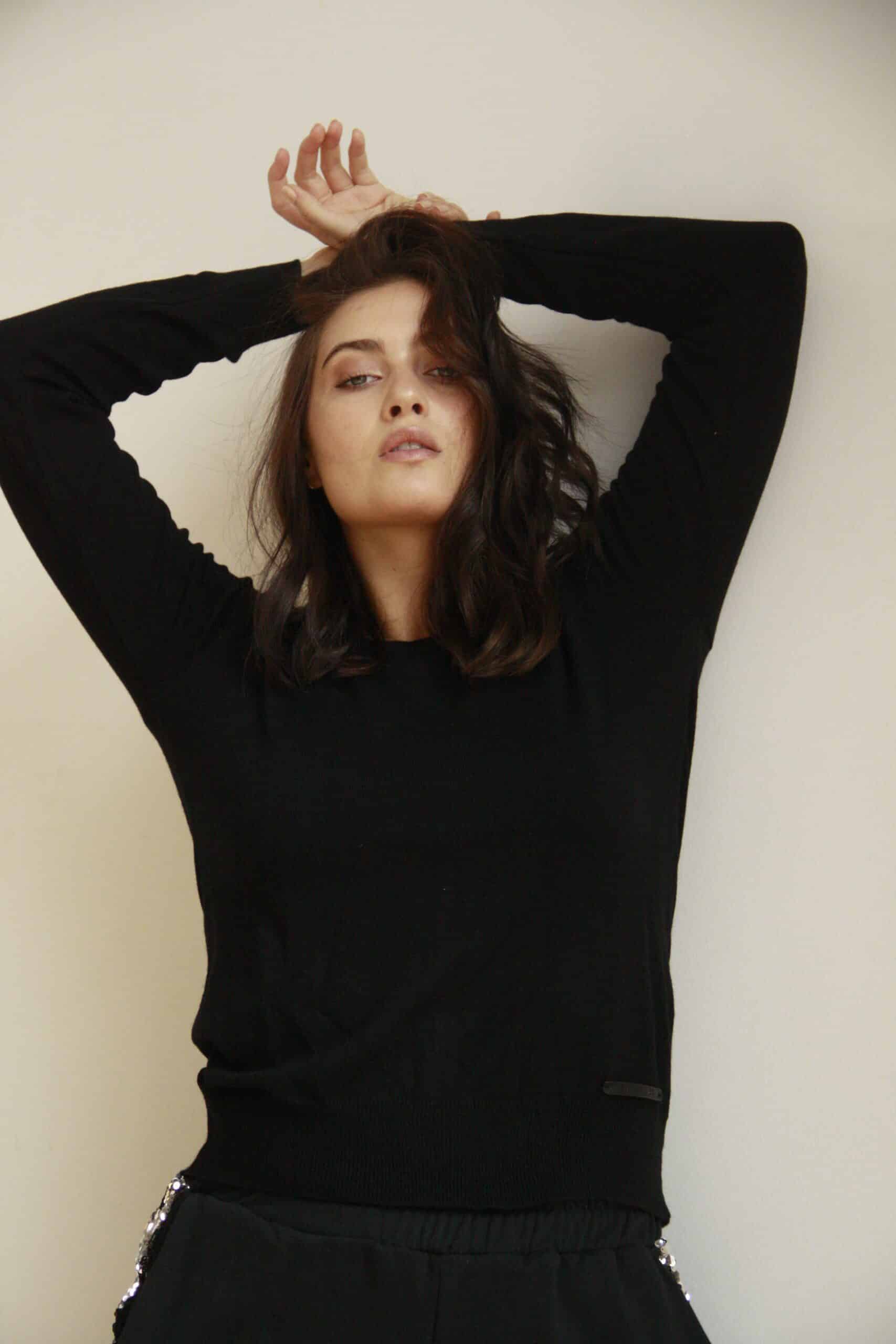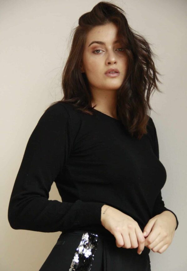 Sweater cuello redondo y manga larga de punto fino elastizado, confeccionado en lurex color negro.
