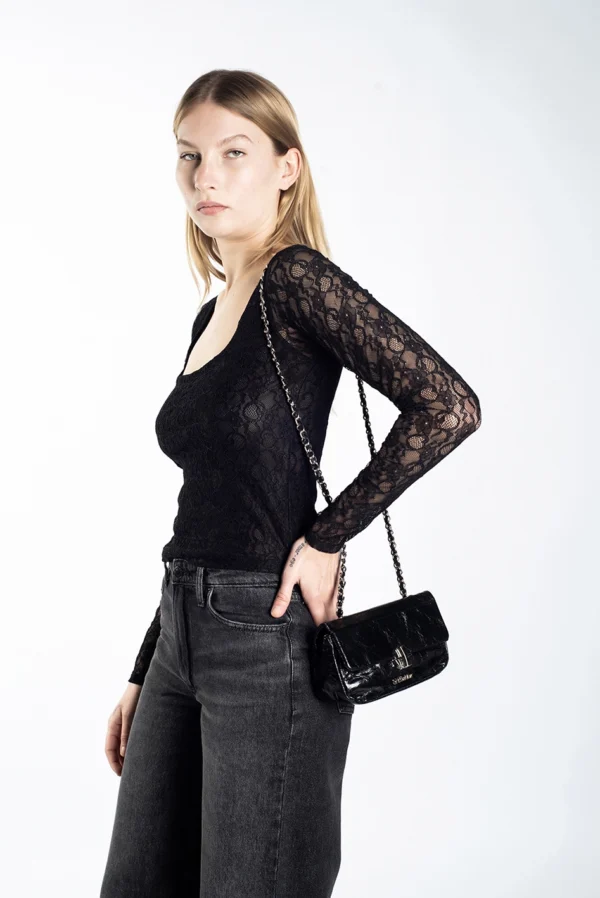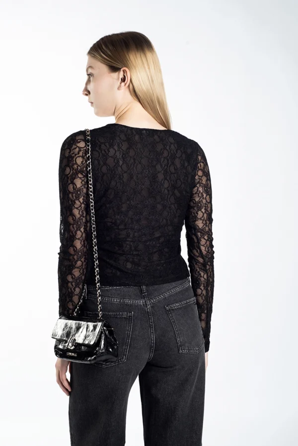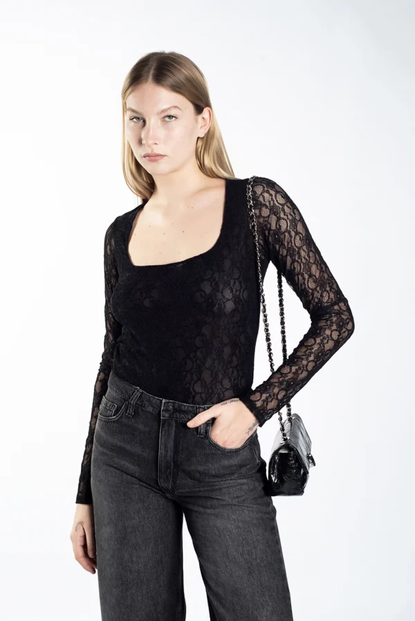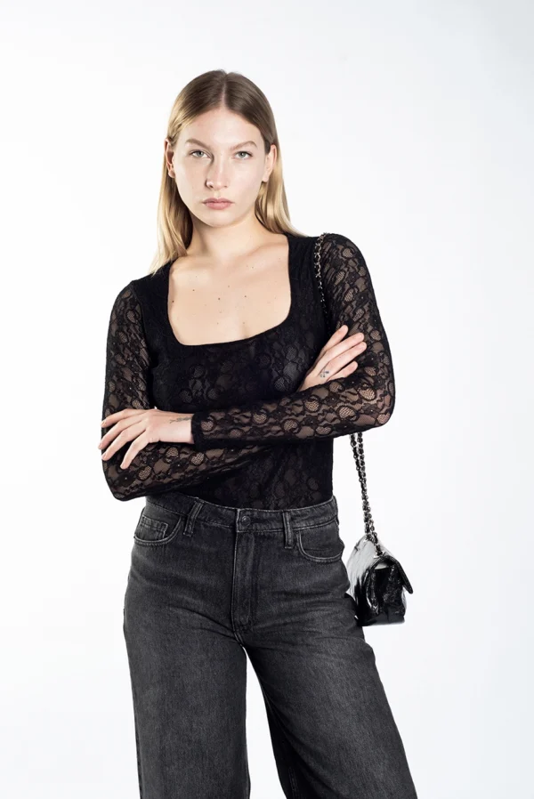 Remera escote recto y mangas largas, de calce anatómico, confeccionada en tull con lycra.