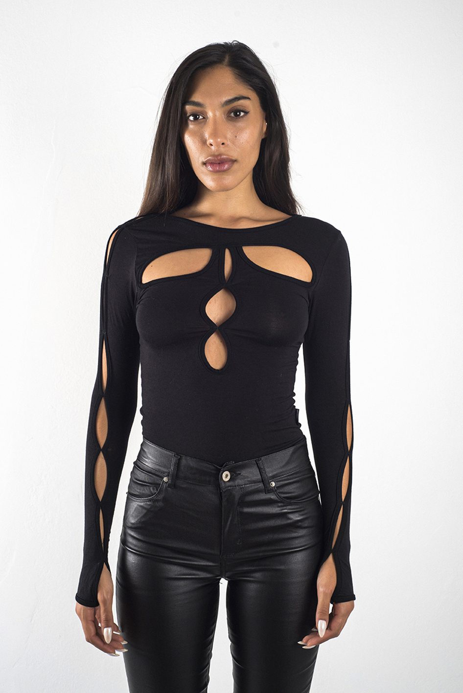 Sustracciones de diferentes medidas en la parte delantera y en las mangas que juntas forman un diseño único para la marca.