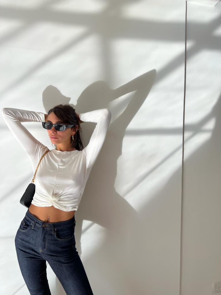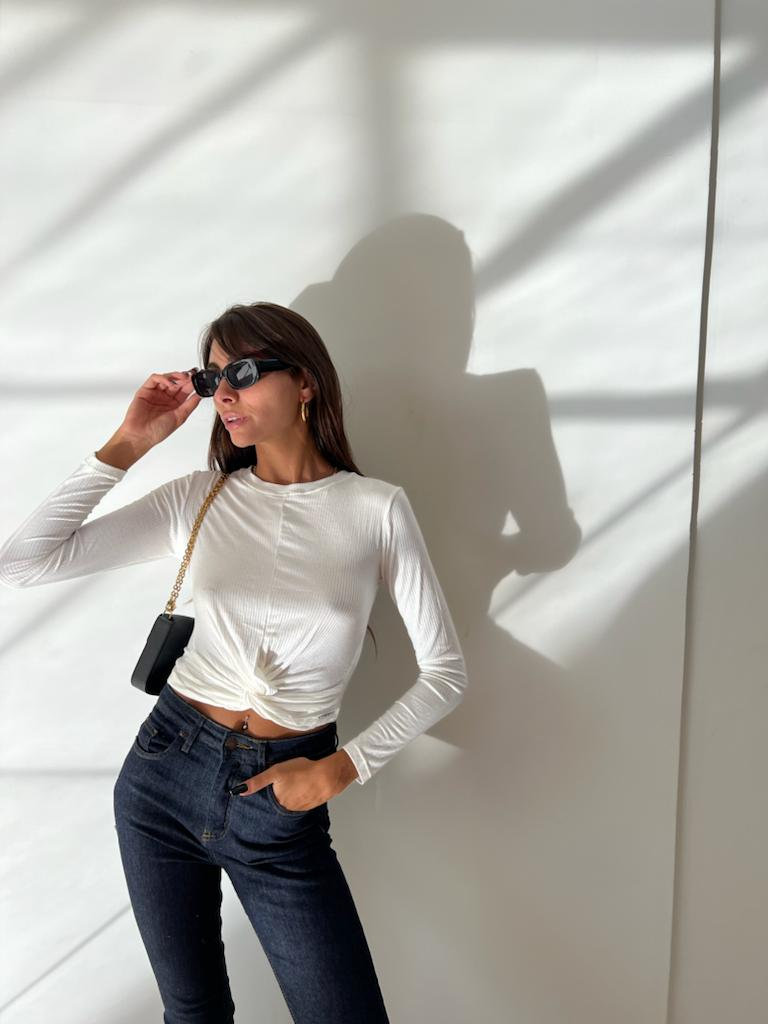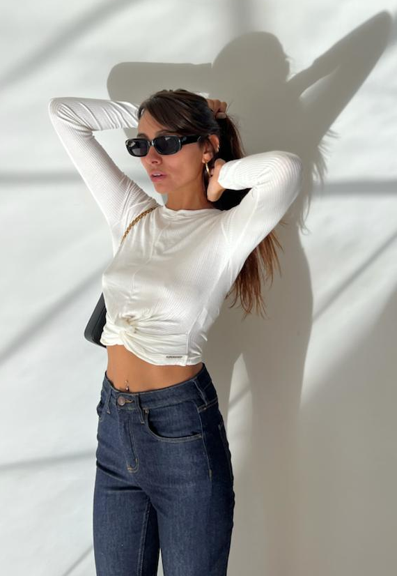 Top manga larga y cuello redondo, confeccionado en rib con lycra.