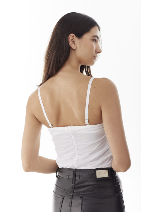 Top confeccionado en microtull con lycra color blanco, con drapeado a ambos lados