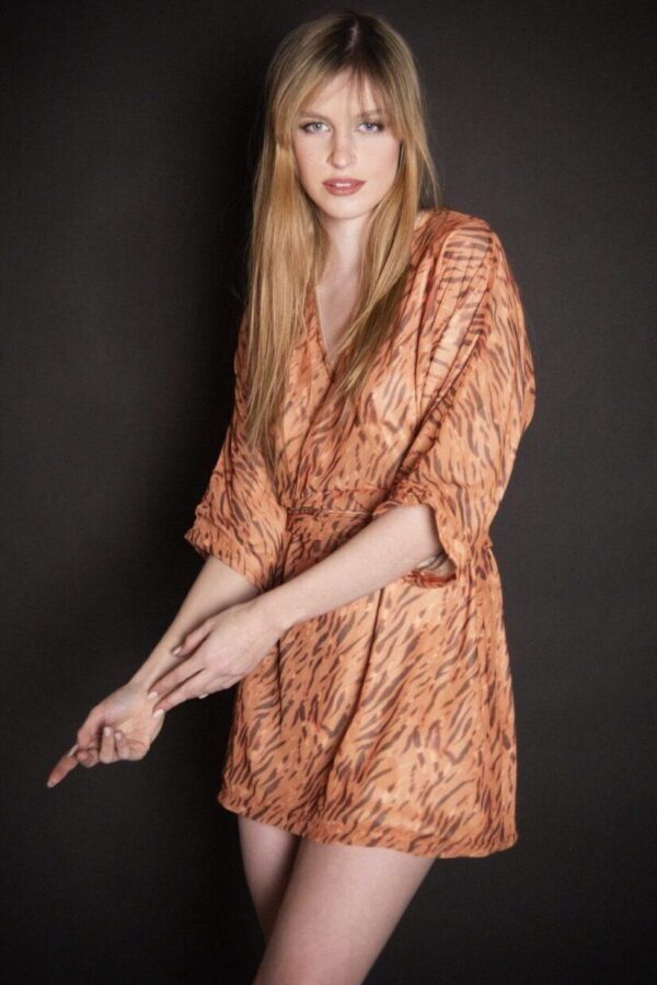 Vestido corto confeccionado en tul con lycra, estampado con un diseño exclusivo para ona saez.
