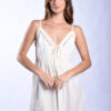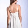Bajo acabado con vuelo, tirantes finos regulables y detalles puntilla a tono con tachas color plata alrededor del busto.