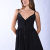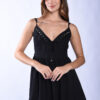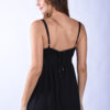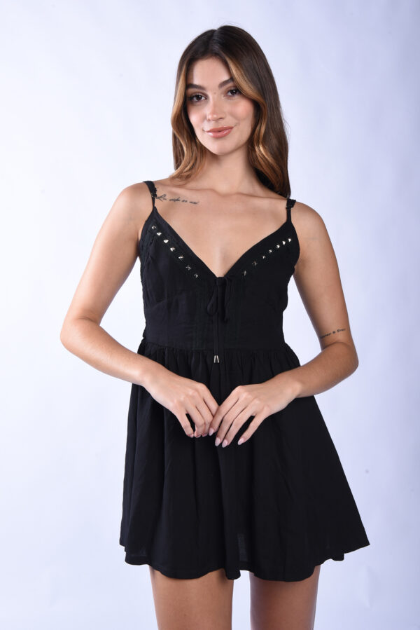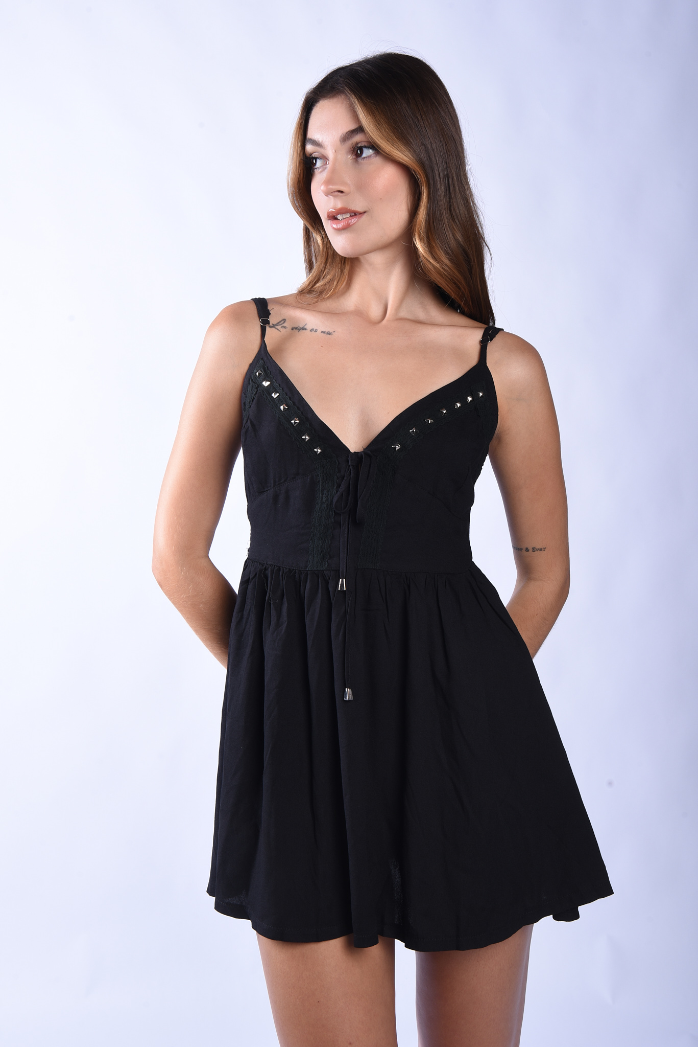 Bajo acabado con vuelo, tirantes finos regulables y detalles puntilla a tono con tachas color plata alrededor del busto.