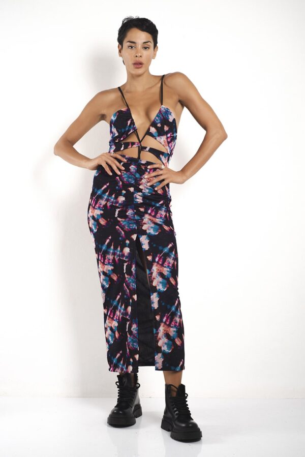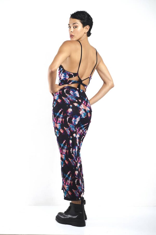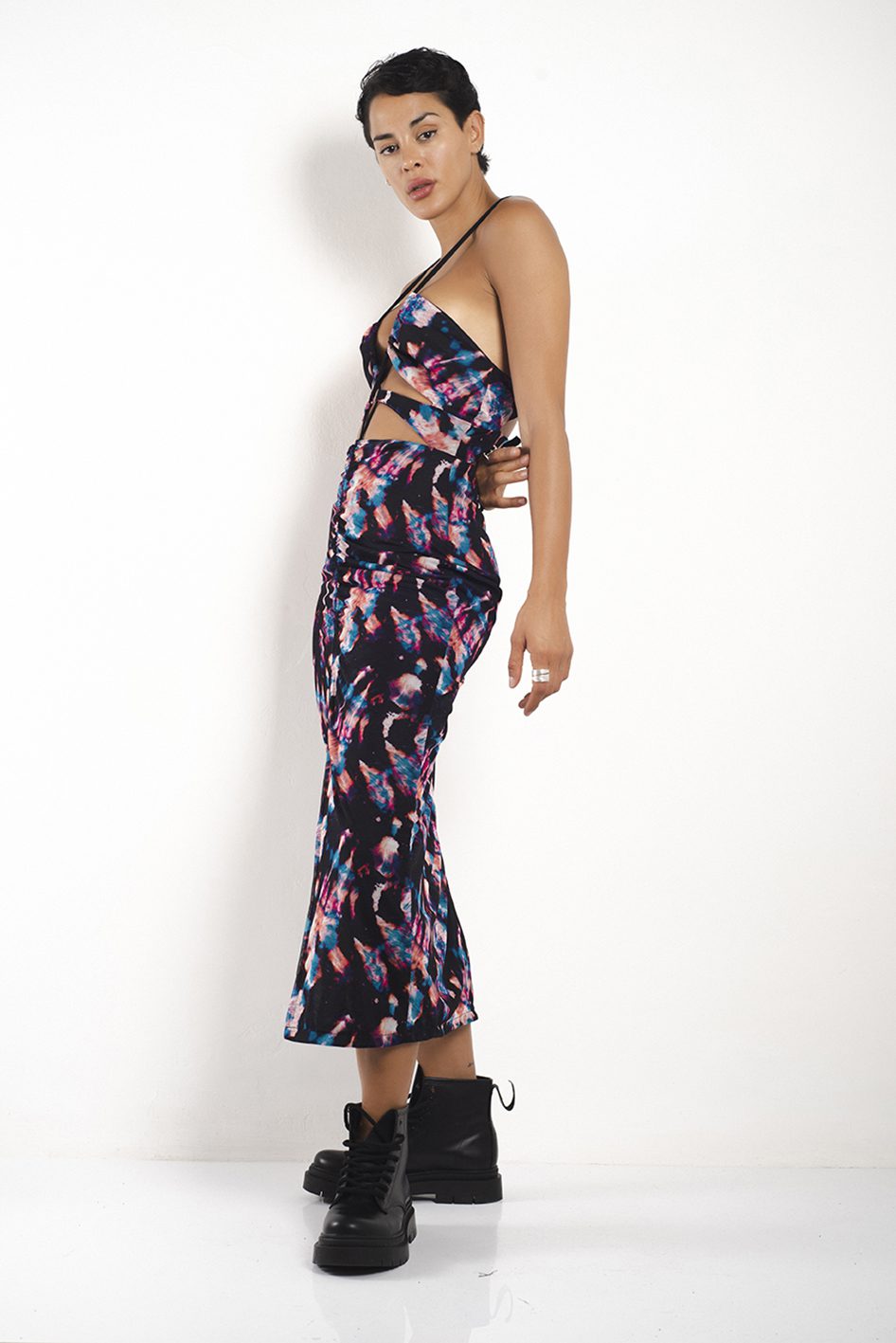Vestido largo elastizado, confeccionado en tul con lycra, estampado con un diseño exclusivo para ona saez.