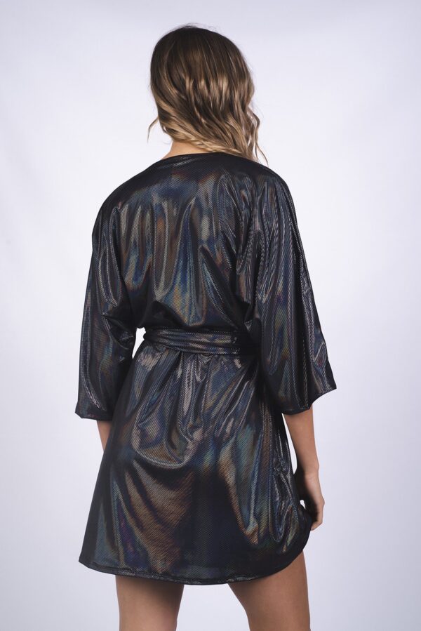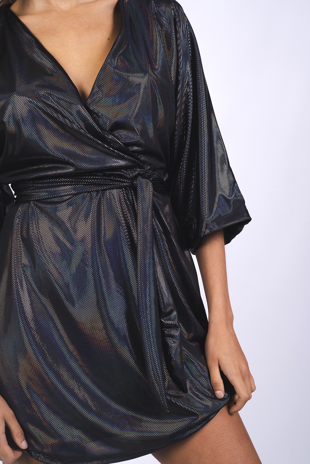 Vestido corto con pronunciado escote en v cruzado al frente, confeccionado en jersey foil multicolor.