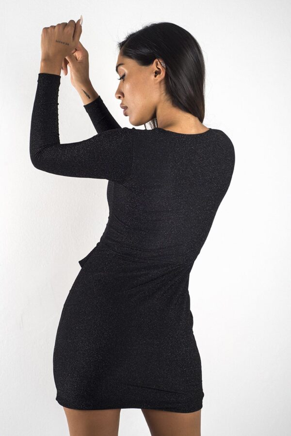 Vestido corto elastizado manga larga, confeccionado en lurex con lycra color negro.