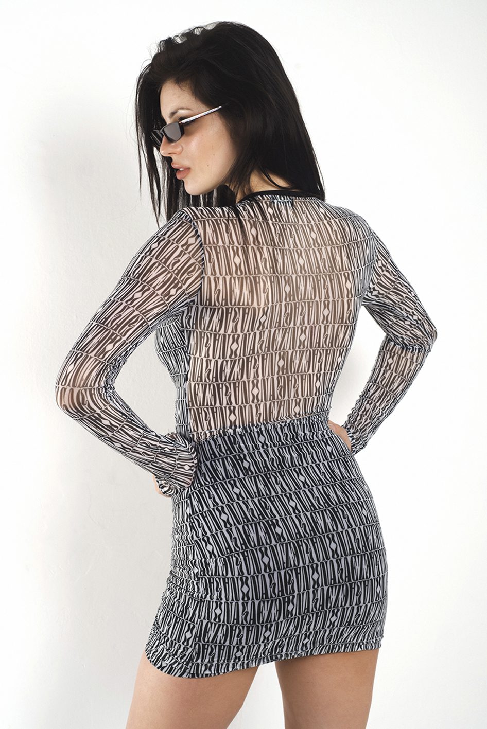Vestido tubo manga larga, confeccionado en tul con lycra, estampado con un diseño exclusivo para ona saez.