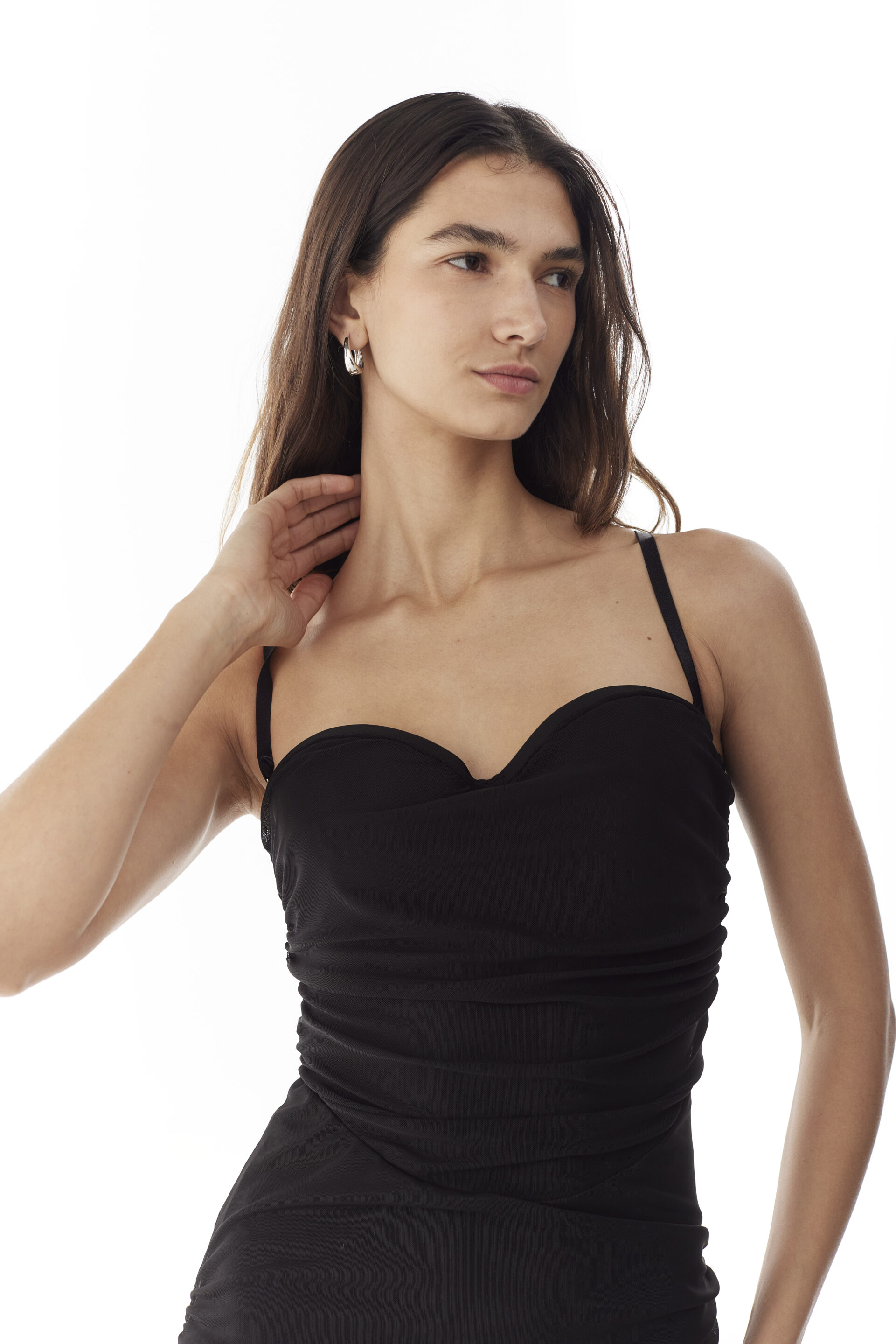 Diseño de drapeado a ambos lados que asegura un ajuste cómodo y preciso, y proporciona una sensación de suavidad y ligereza al contacto con la piel. Su elasticidad es uno de los puntos fuertes, permitiendo que el vestido se amolde al cuerpo de manera natural.