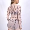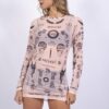 Vestido corto manga larga, confeccionado en tull con lycra color nude.