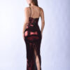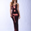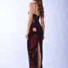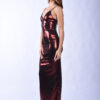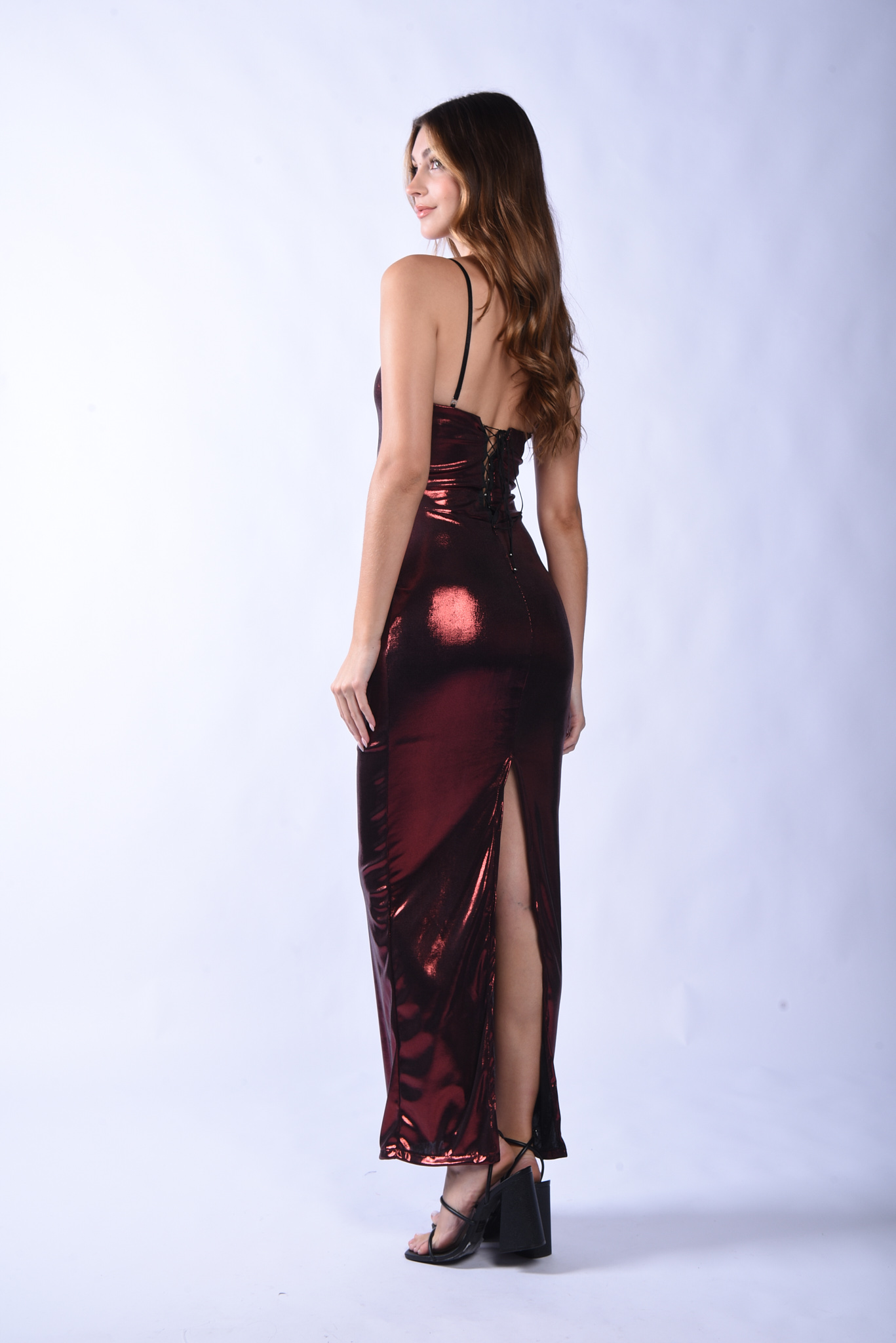 Vestido escote en v, confeccionado en jersey metalizado color rojo, compuesto por un 20% de elastano y un 80% de poliamida, combinación que no solo asegura un ajuste ceñido y flexible, sino que también garantiza una suavidad al tacto que se siente cómoda y lujosa contra la piel.