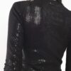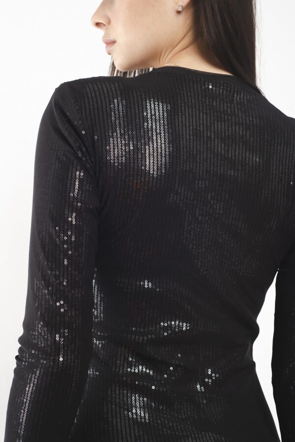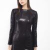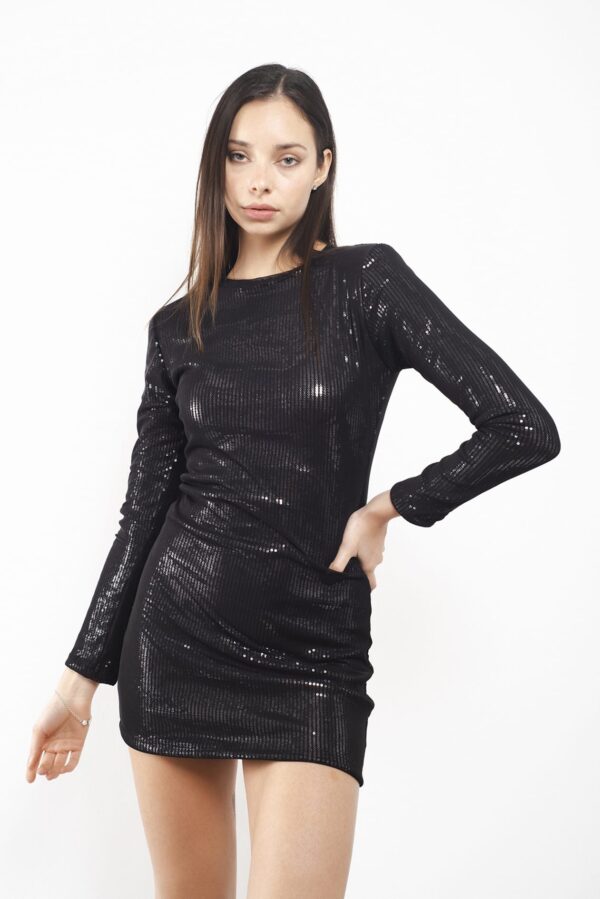 Vestido corto elastizado manga larga, confeccionado en jersey con lentejuelas bordadas color plata brillantes y por encima esta forrado en tul con lycra a tono.