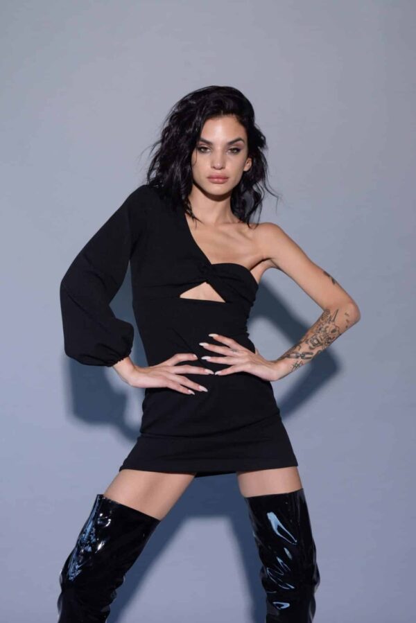 Vestido corto ceñido al cuerpo, confeccionado en crepé elastizado con escote asimétrico y torzada en la parte del pecho